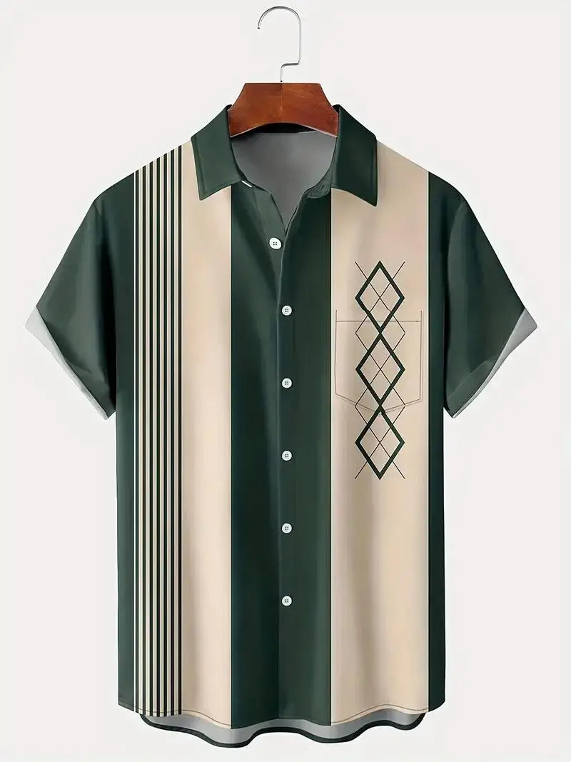 Summer New Trendy Hawaiian Fashion Shirt with Retro Bowling Ball Geometric Print Men's Shirt with Pocket Button Large Cloth