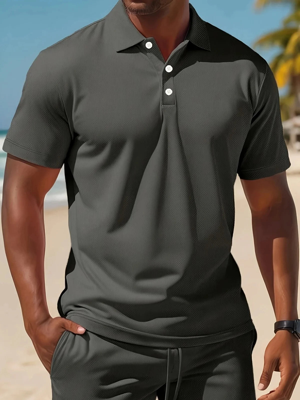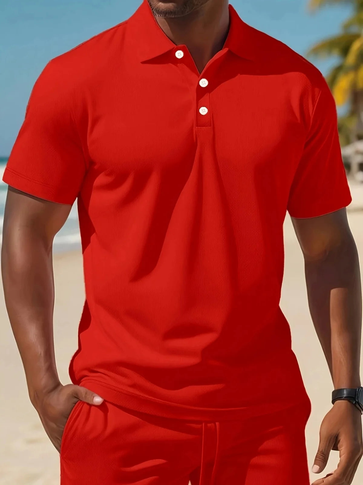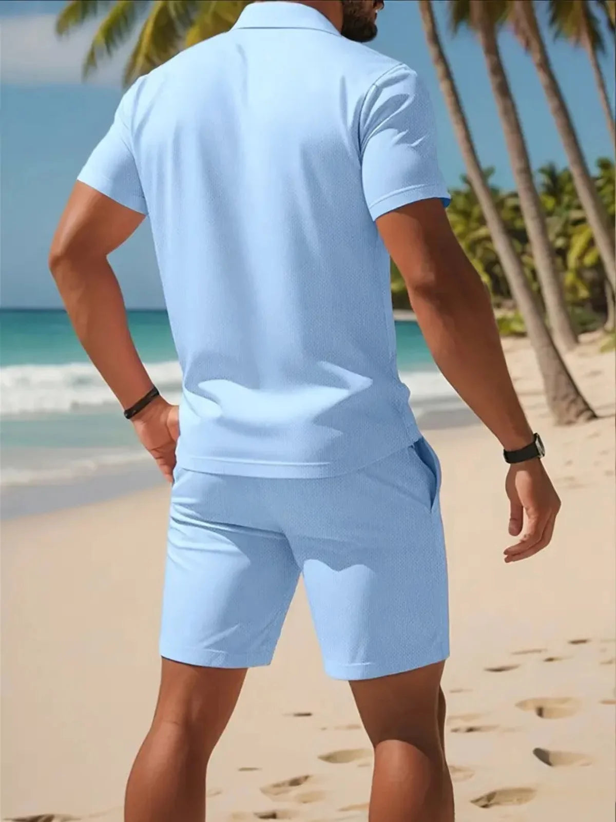 2025 Men's New Summer mesh lapel short sleeve and Shorts Casual Set solid color loose beach sports breathable set