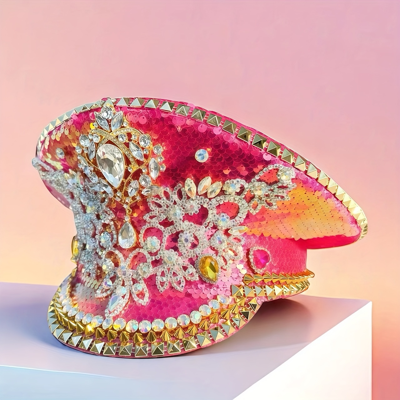 A Unisex Candy Pink Steampunk Captain'S Hat Adorned with Rhinestones, Perfect for Valentine'S Day, Parades, And Various Parties Such As Adult Gatherings, Music Festivals, Cruise Parties, Bars, Ladies' Nights, Bachelorette Par