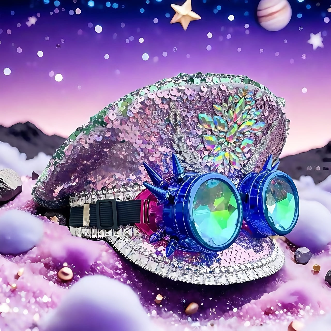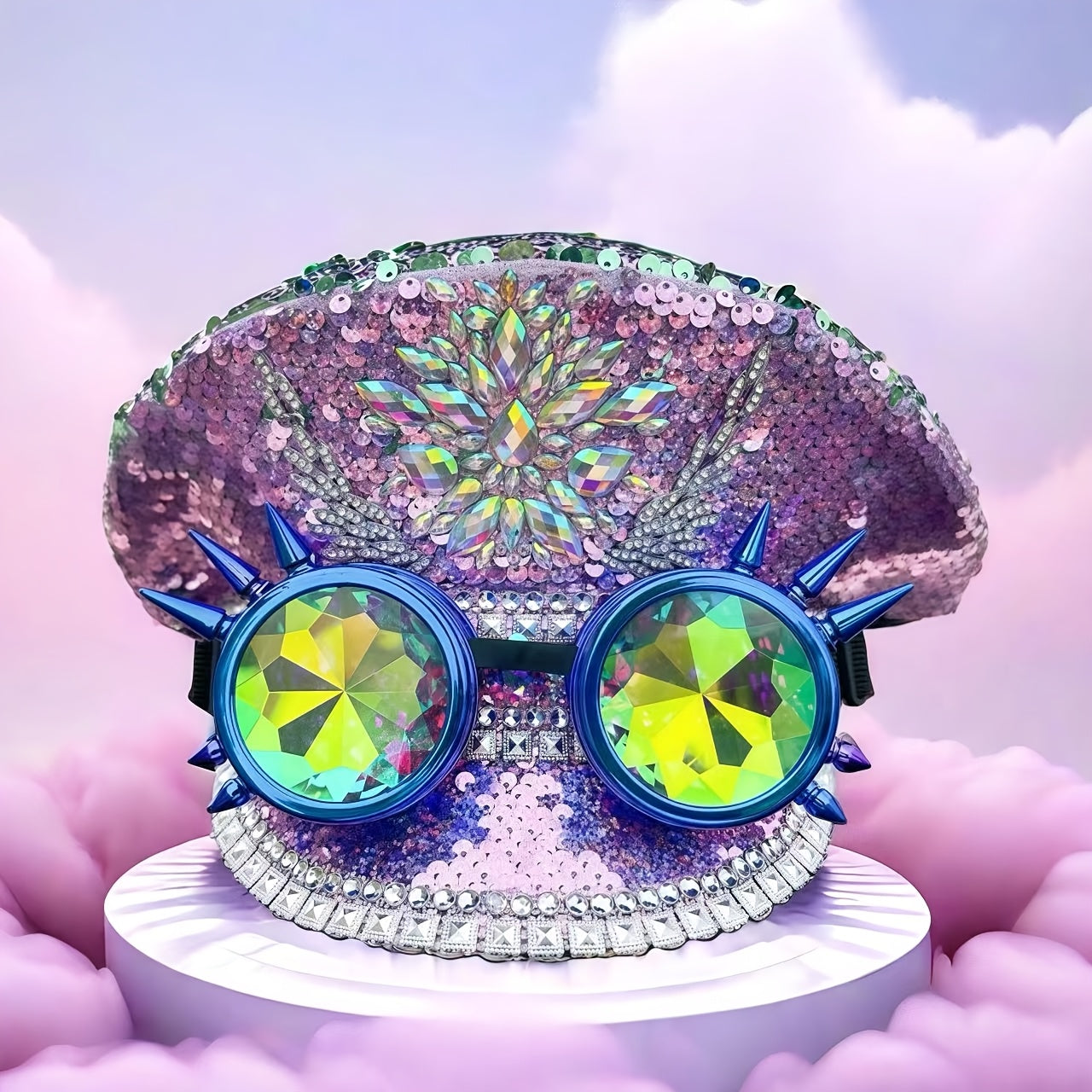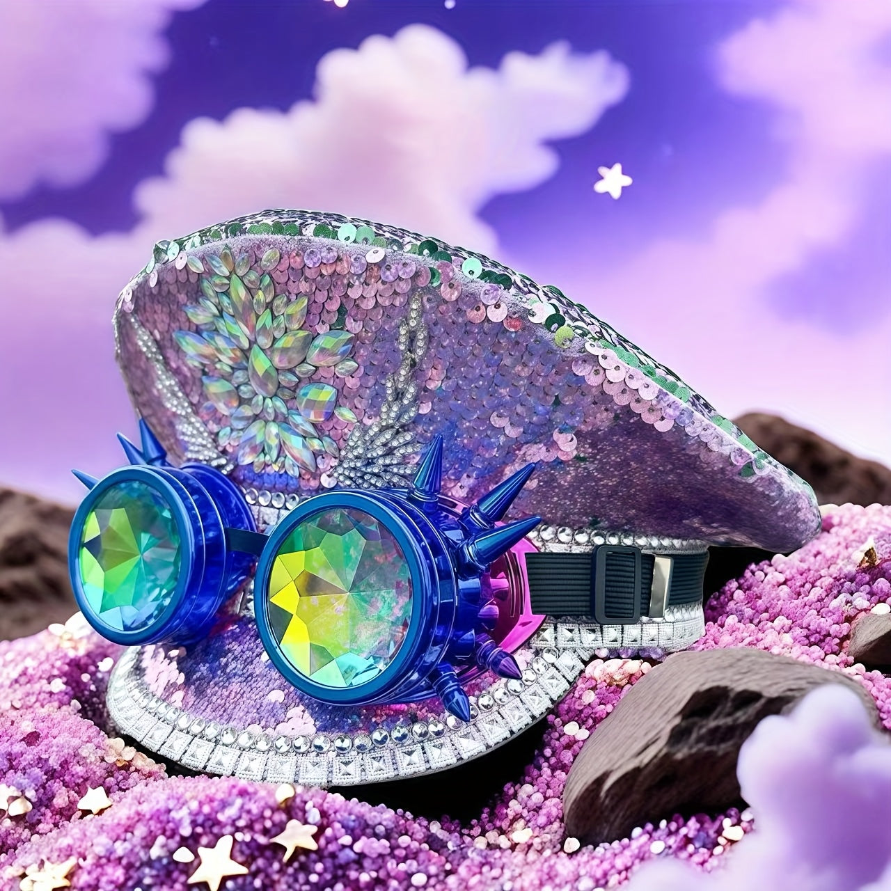 Bling Captain Hat Rhinestone with Purple Sequins & Steampunk Glasses - Sparkly Army Cap for Burning for Man Festival, Raves, Music Parties - Military Accessories, Steampunk Costume Hat