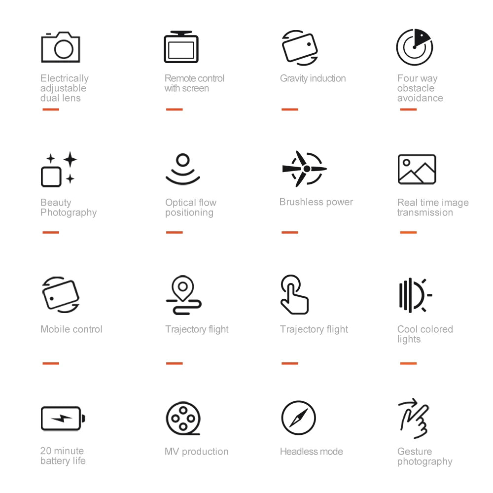 Functions: up/down, forward/backward, left/right turn, lateral flight, headless mode, optical flow positioning hovering, electric dual camera, four-sided obstacle avoidance, 360-degree roll, altitude hold mode, WiFi FPV, with screen control remote control, fuselage power display