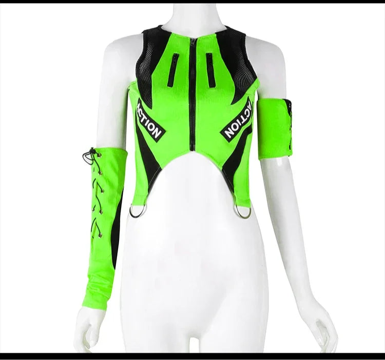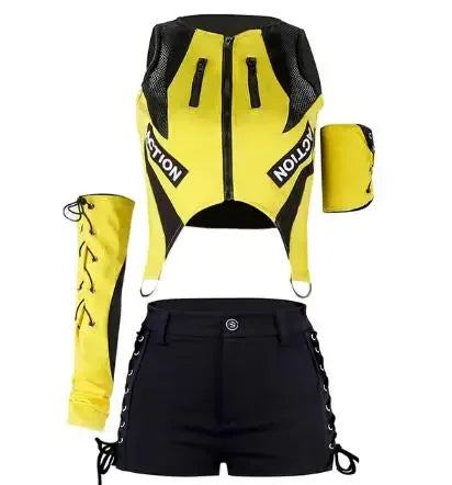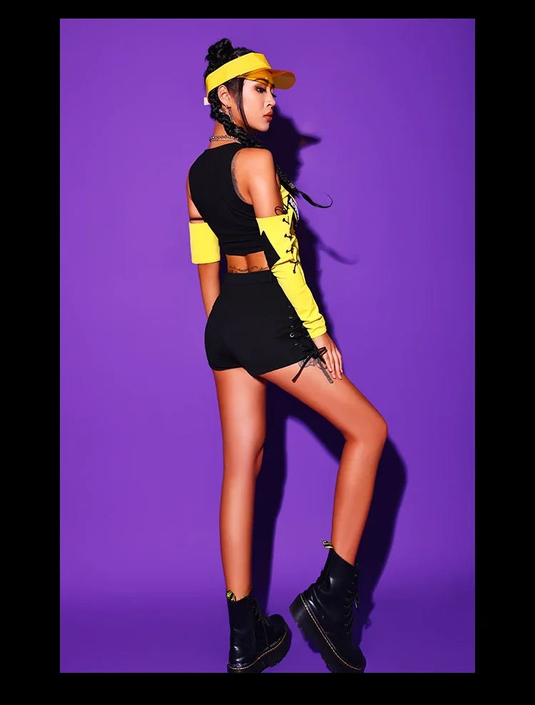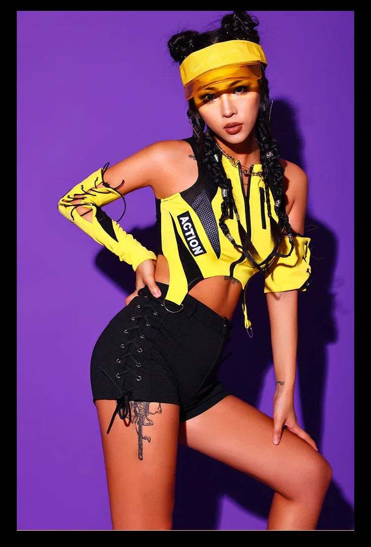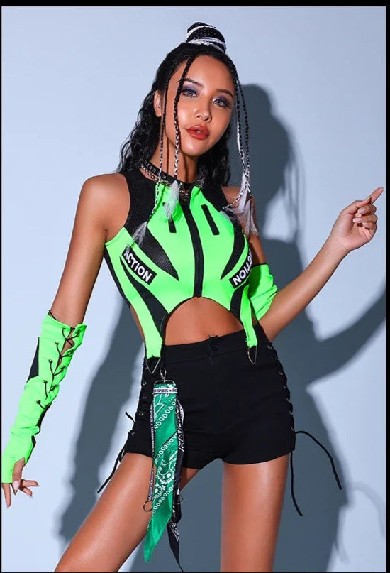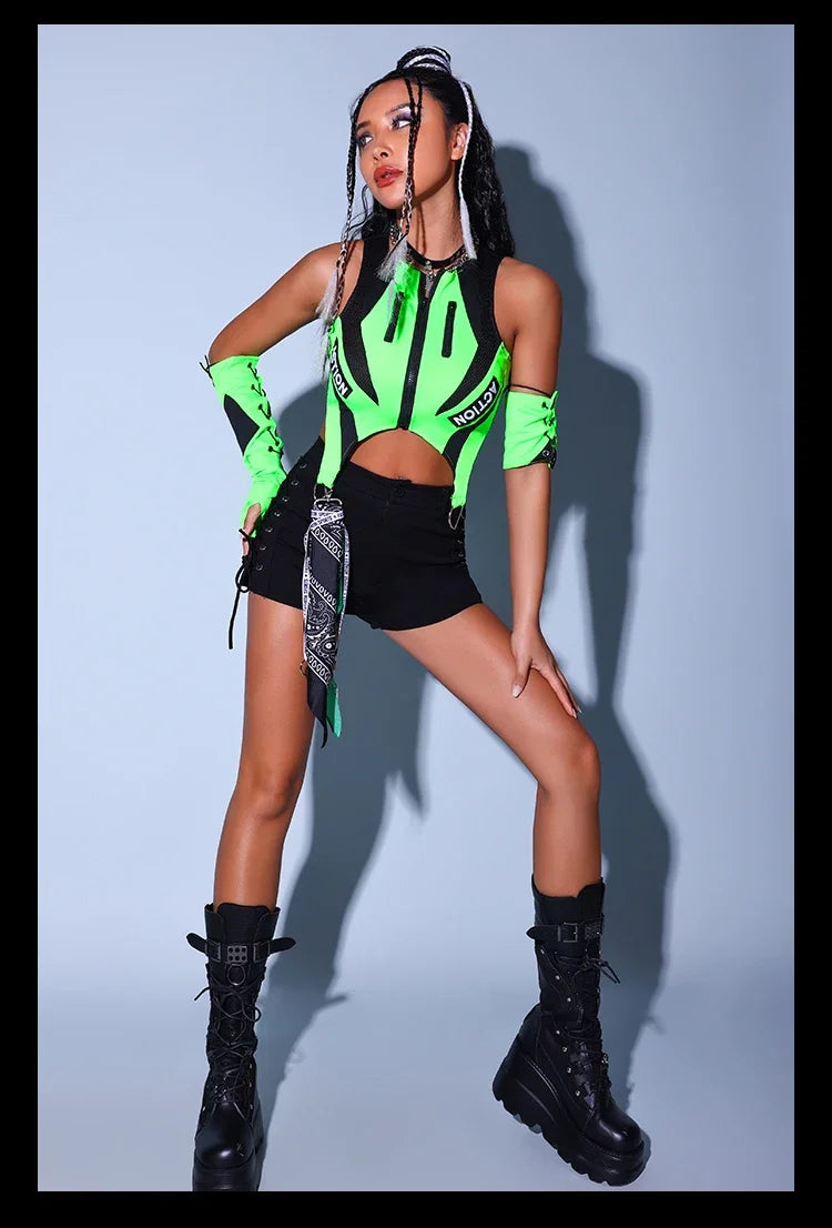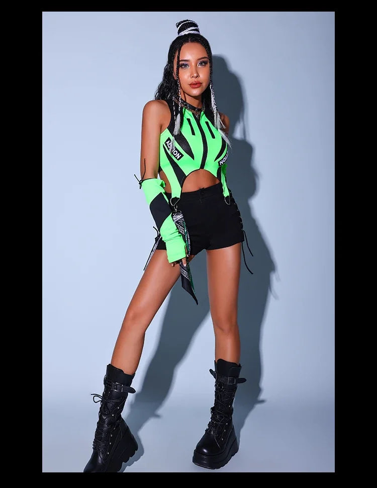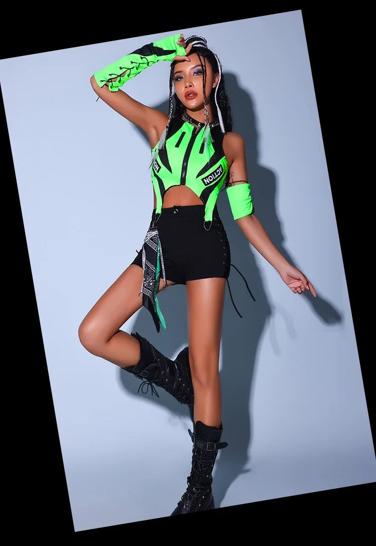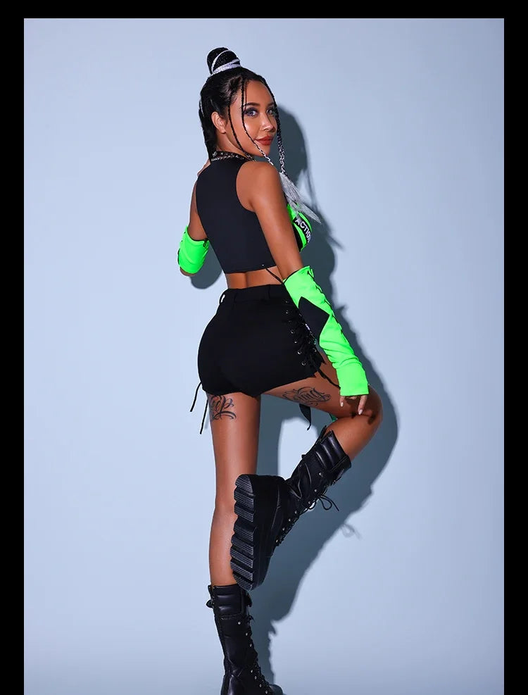 Girls Group Jazz Dance Costumes Rave Clothes Fluorescent Green Tops Black Shorts Kpop Outfits