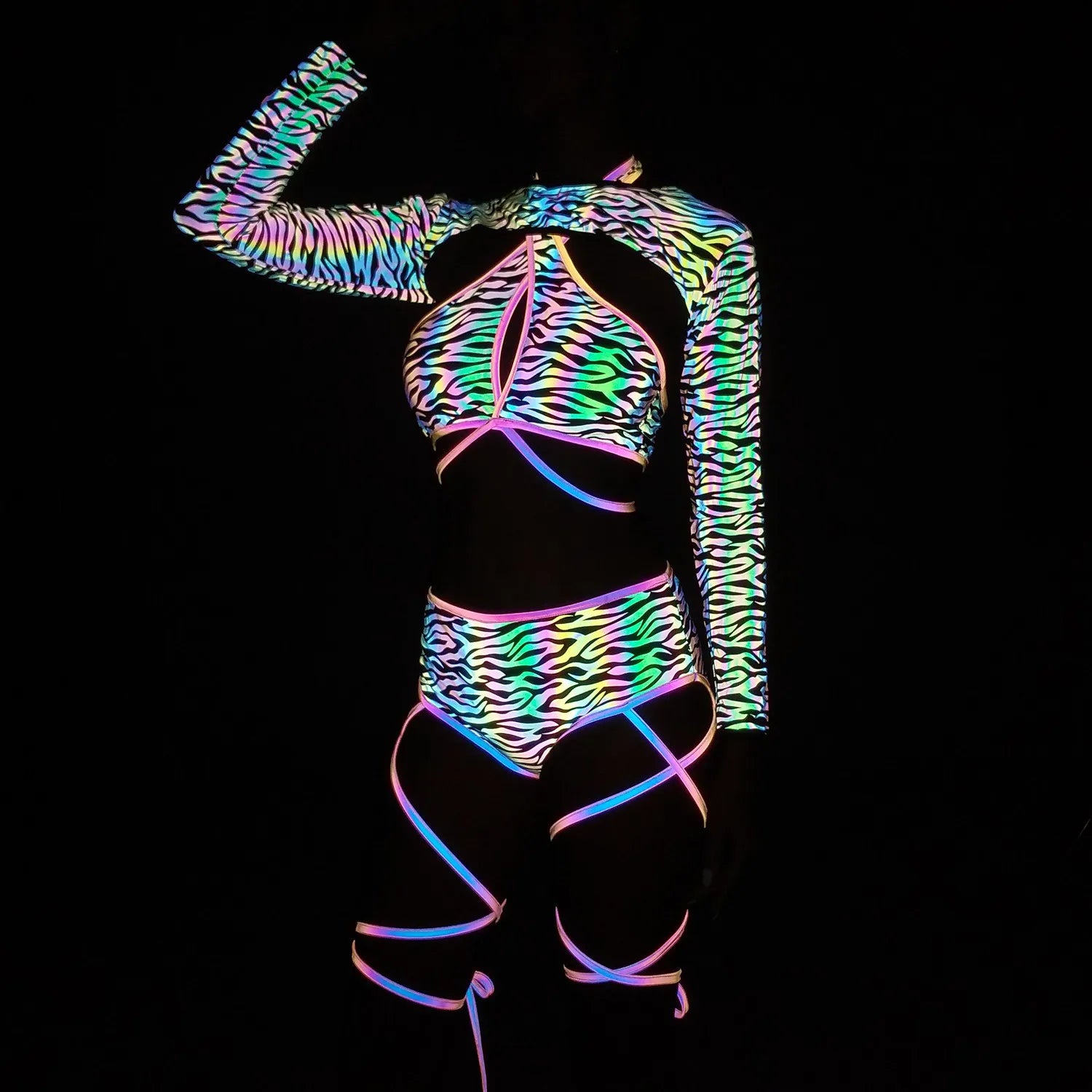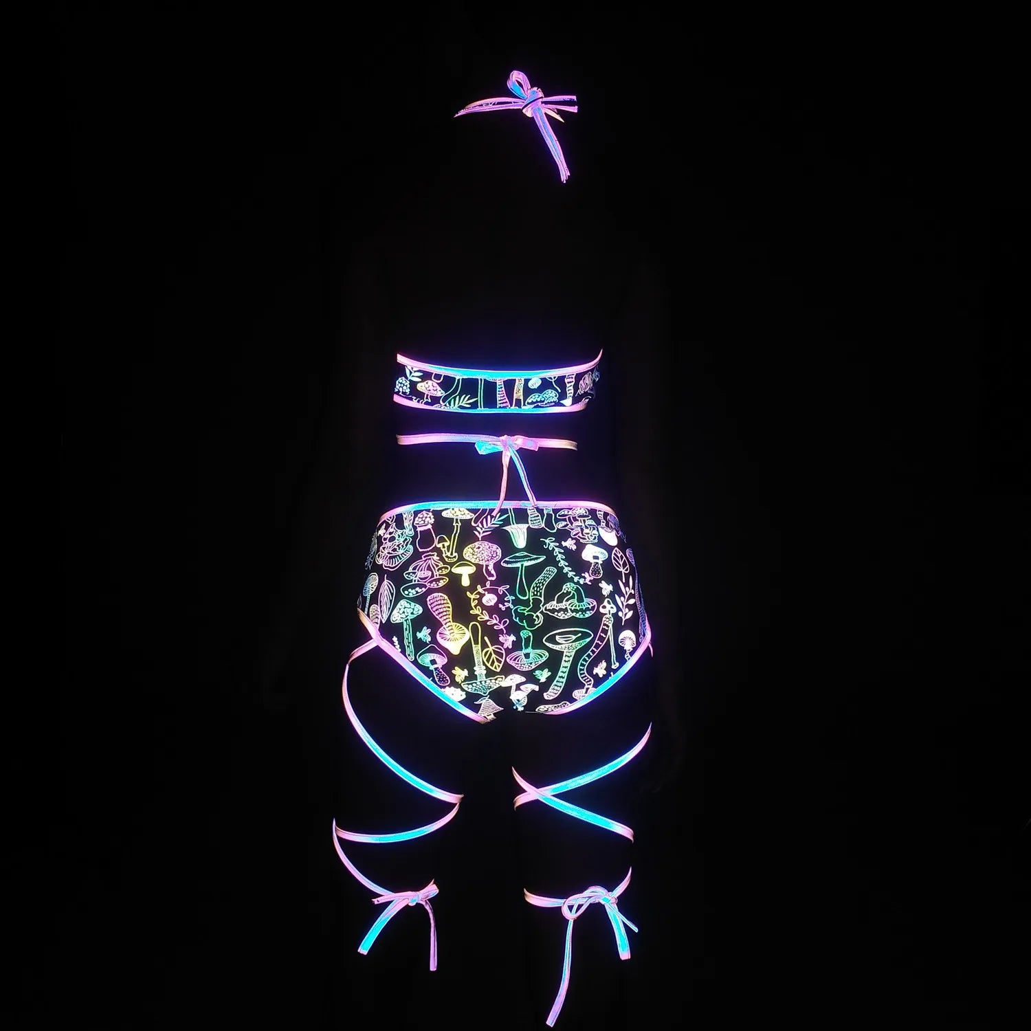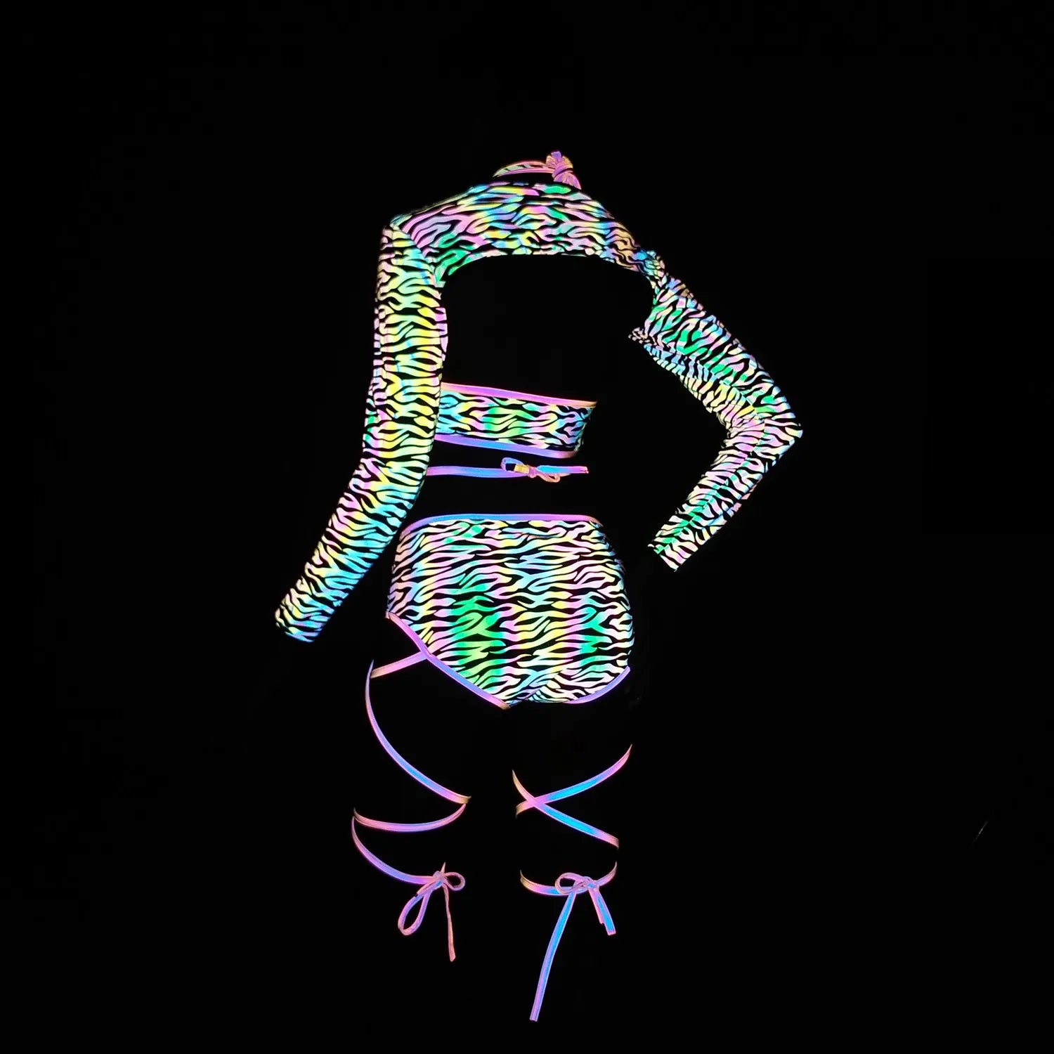 Harajuku Fashion Women Colorful Reflective Set Bandage Shorts+Bra+Crop Top Techwear Clothing Conjuntos Curtos