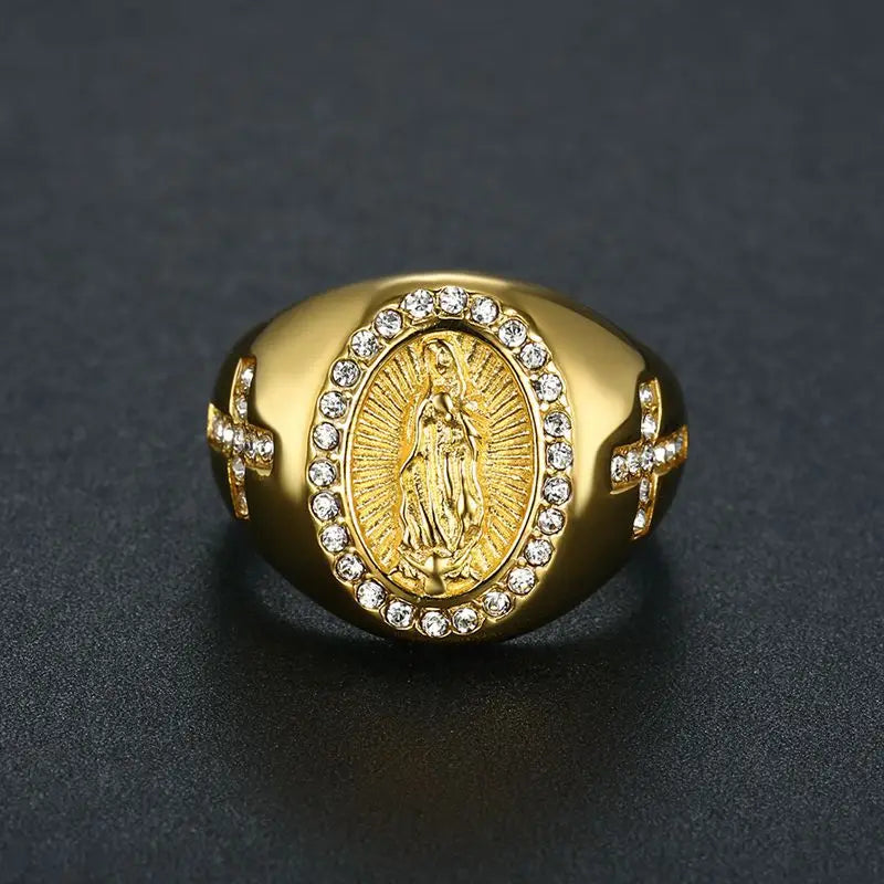 Men's Gold Plated color Cubic Zirconia Virgin Mary Religious Ring