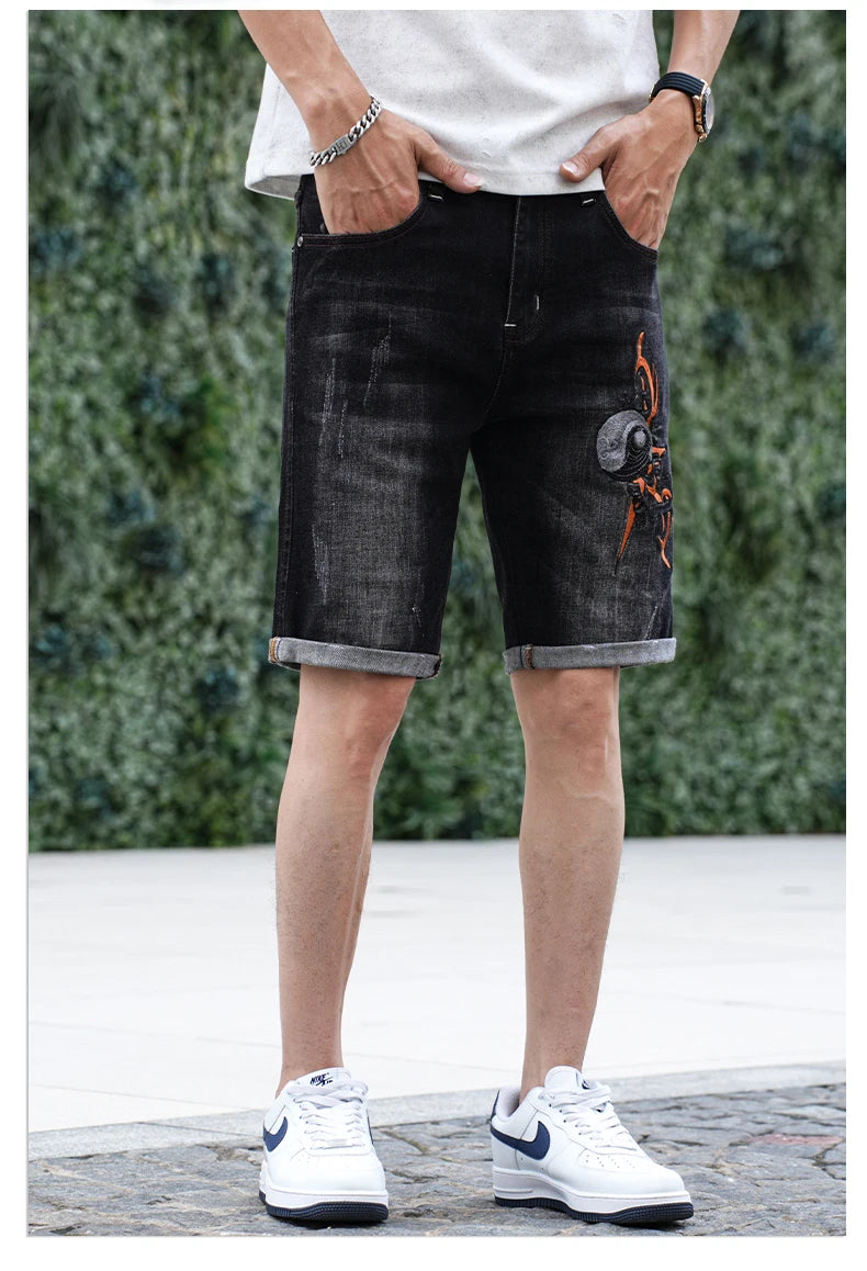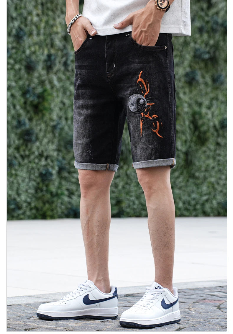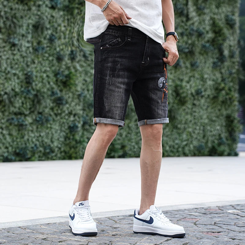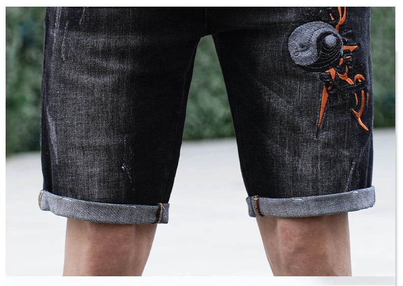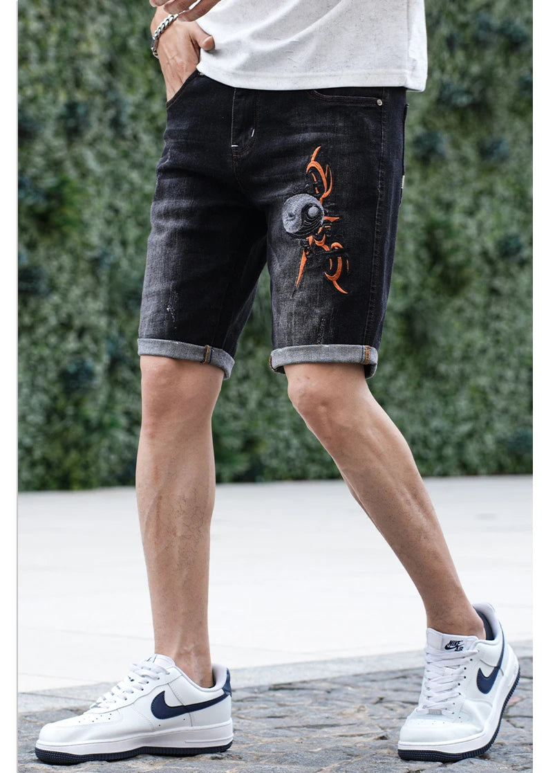 New Men's Shorts Summer Washed Stretch Denim Shorts Fashion Tai Chi Embroidery Short Jeans Male Streetwear Brand Clothing