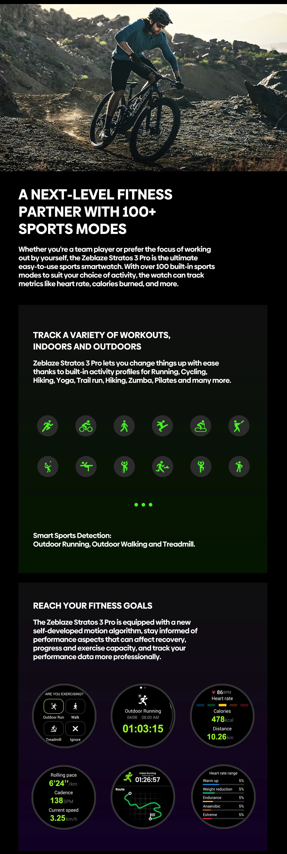 【Smart Sports Detection with 100+ Sports Modes】Whether you're a team player or prefer the focus of working out by yourself, the Zeblaze Stratos 3 Pro is the ultimate easy-to-use sports smartwatch. With over 100 built-in sports modes to suit your choice of activity, the watch can track metrics like heart rate, calories burned, and more.