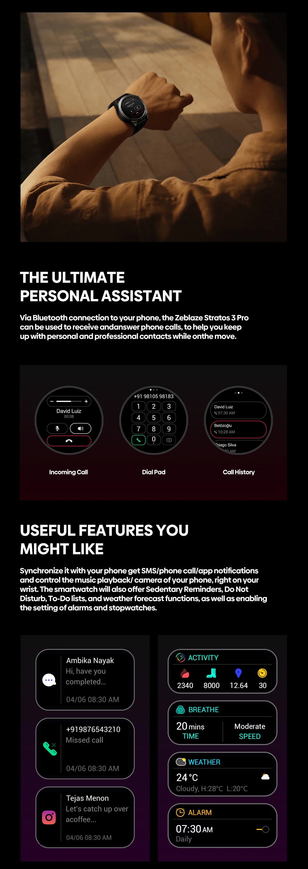 【The Ultimate Personal Assistant】Via Bluetooth connection to your phone, the Zeblaze Stratos 3 Pro can be used to receive and answer phone calls, to help you keep up with personal and professional contacts while on the move.