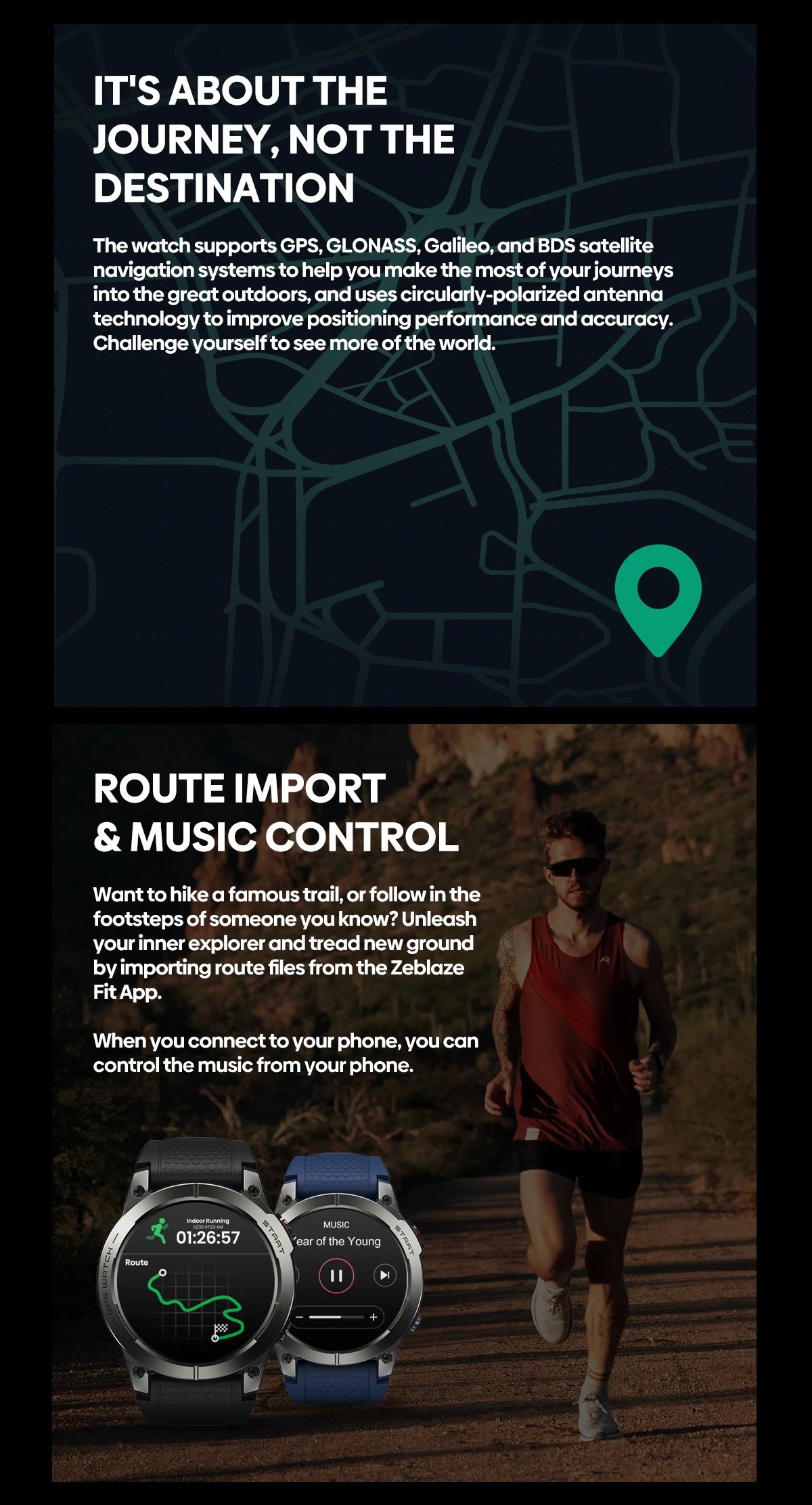 【Route Import & Music Control】Want to hike a famous trail, or follow in the footsteps of someone you know? Unleash your inner explorer and tread new ground by importing route files from the Zeblaze Fit App. Listen to your music list on your watch without using your cell phone. Or, use the watch to control music from your phone.