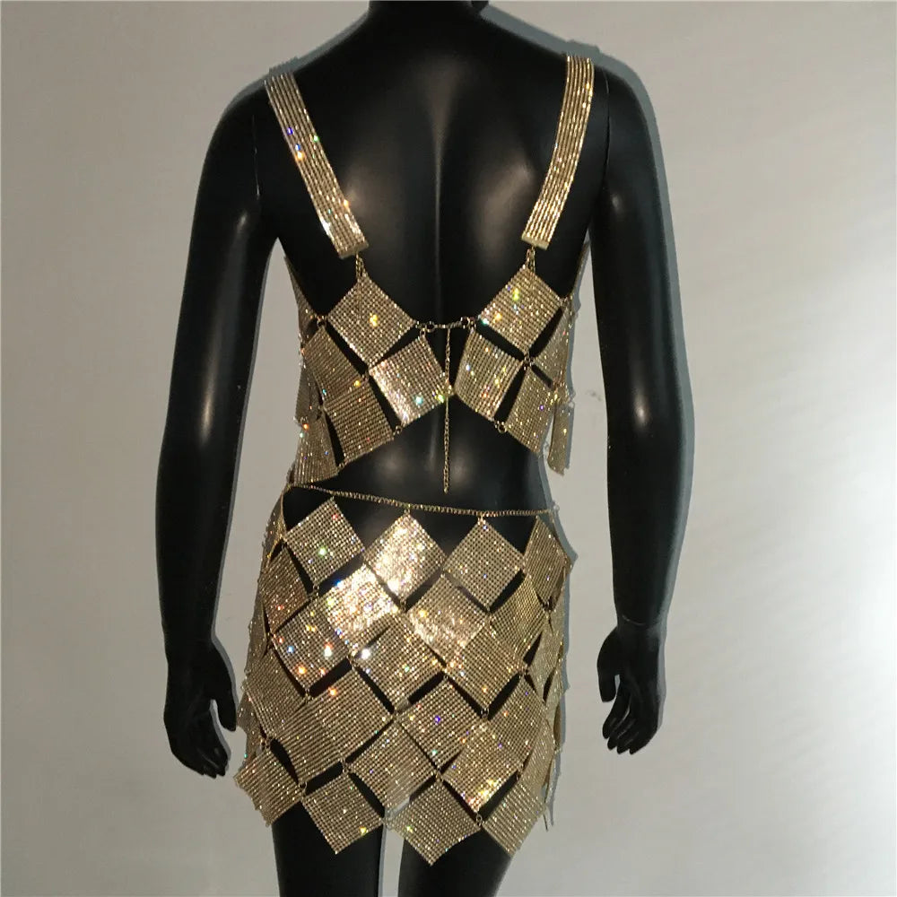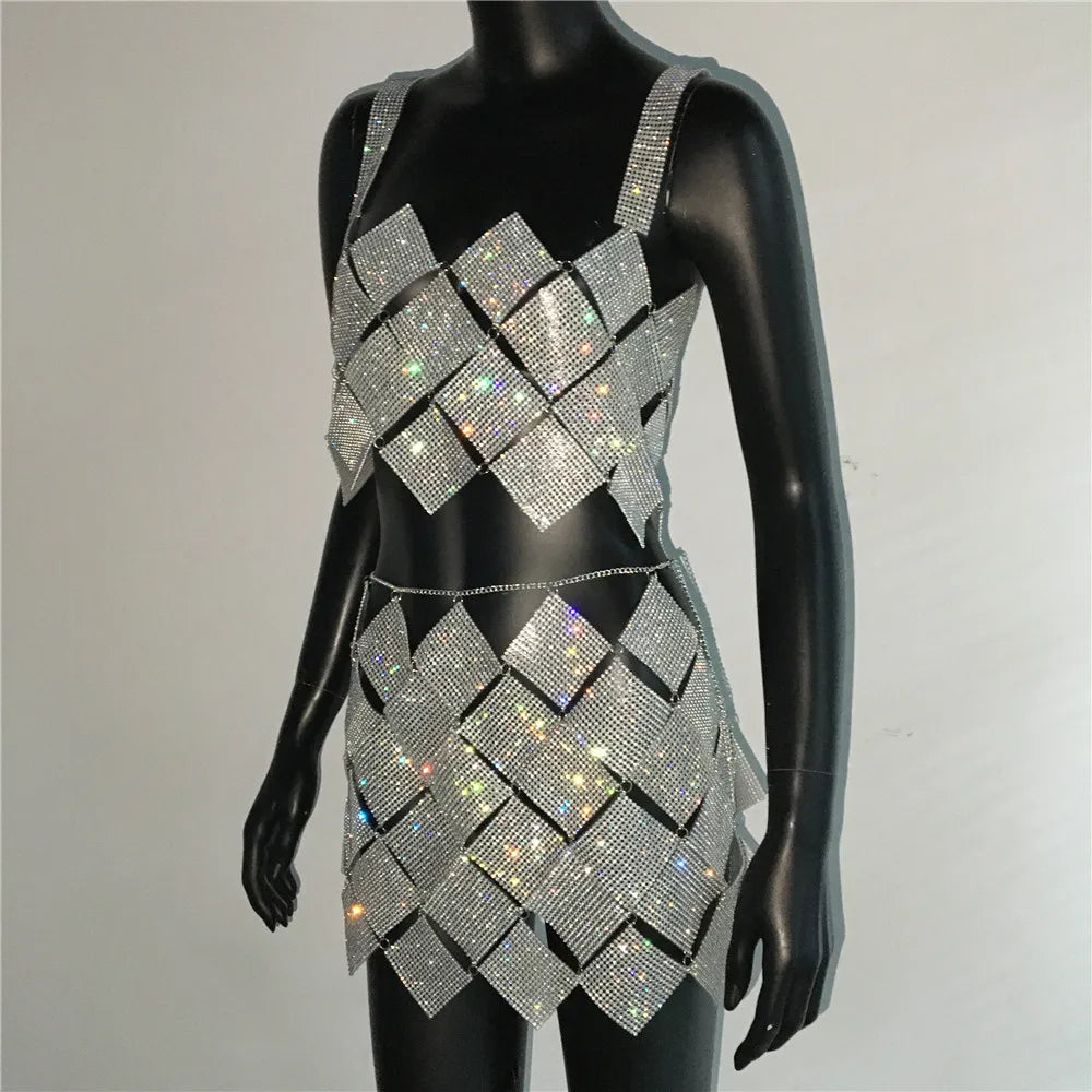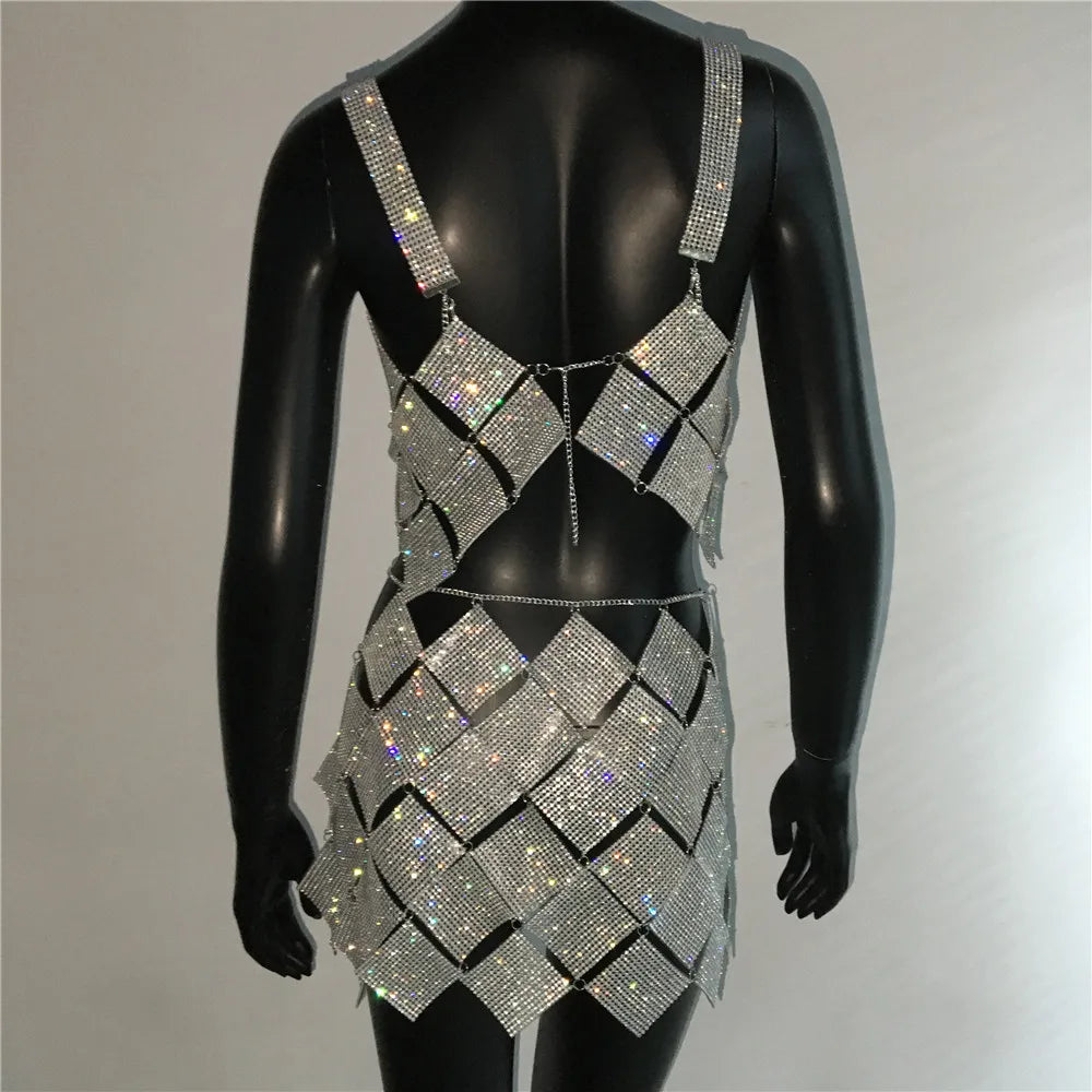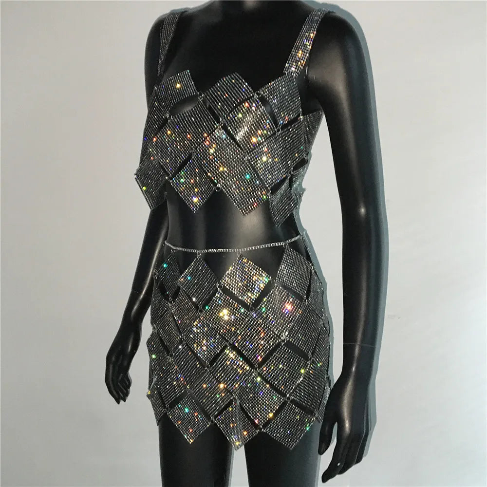Shiny Crystal Rhinestone Women 2 Piece Set Sexy Hollow Out Backless Rhombus Splicing Tank Tops Diamond Mini Skirt Club Outfits