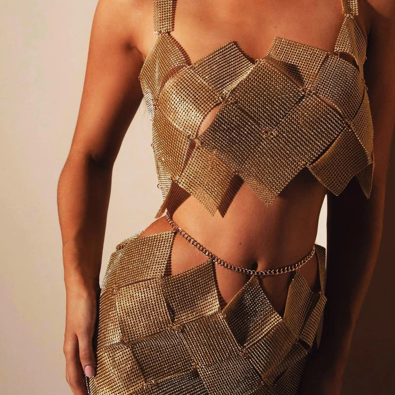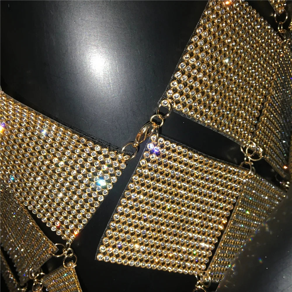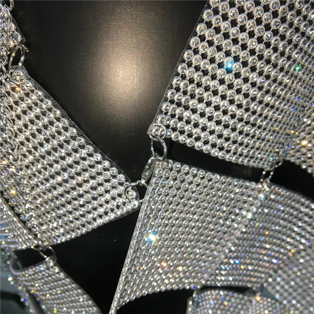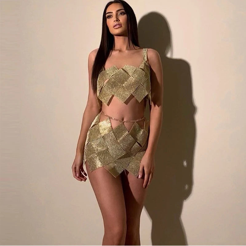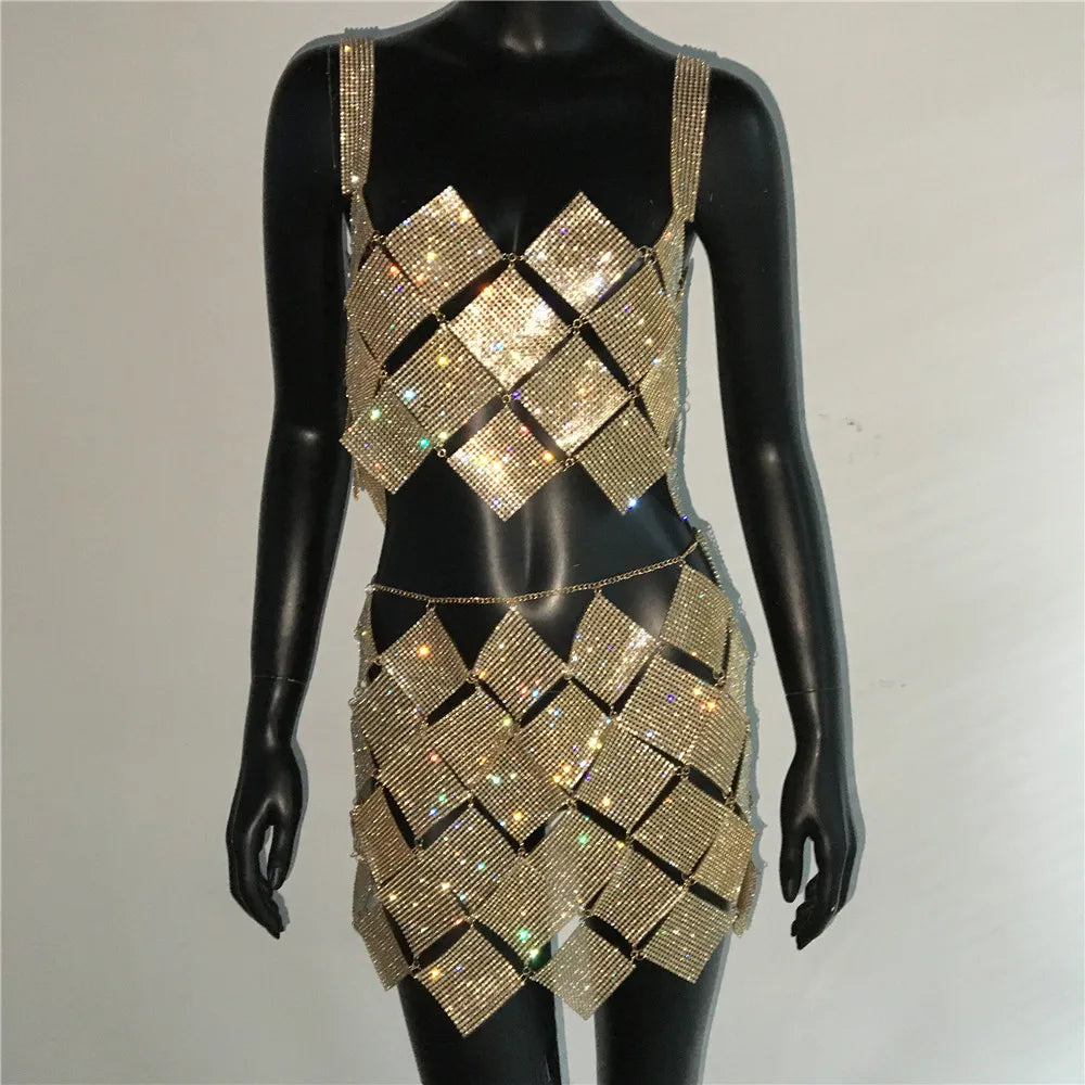 Shiny Crystal Rhinestone Women 2 Piece Set Sexy Hollow Out Backless Rhombus Splicing Tank Tops Diamond Mini Skirt Club Outfits