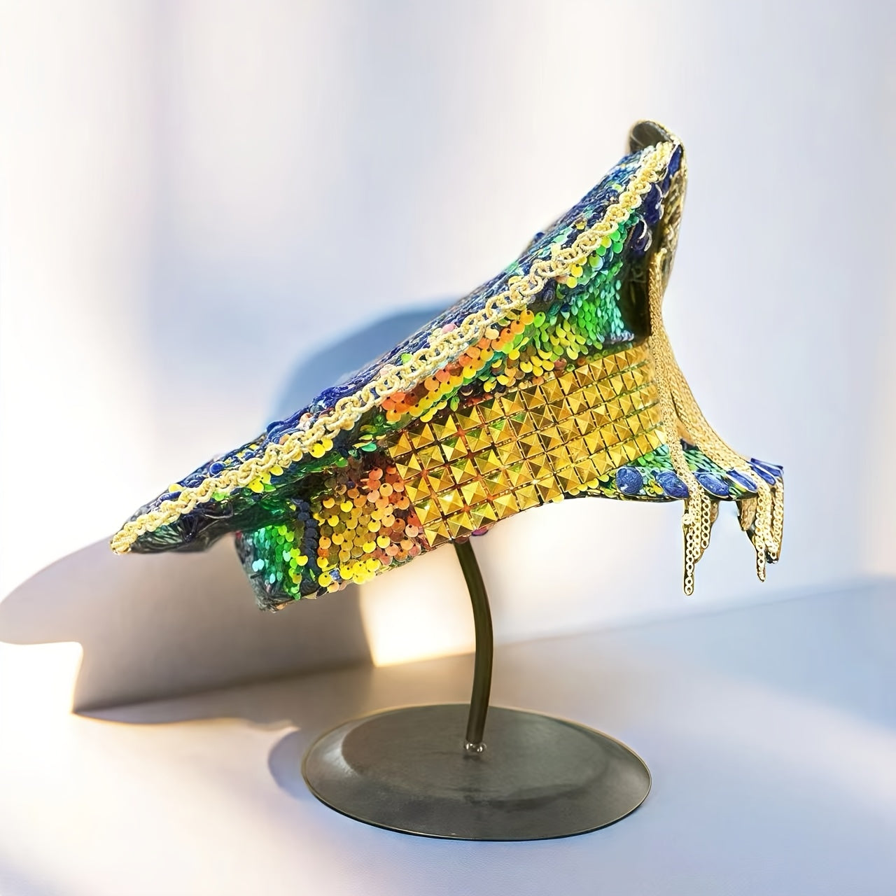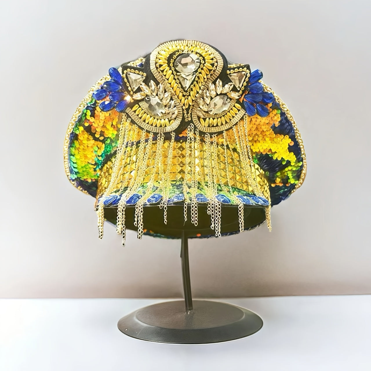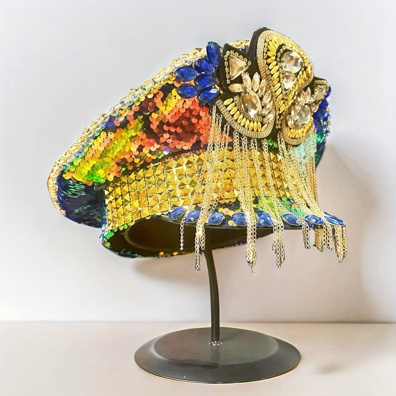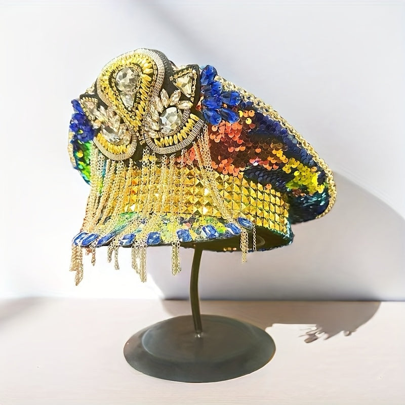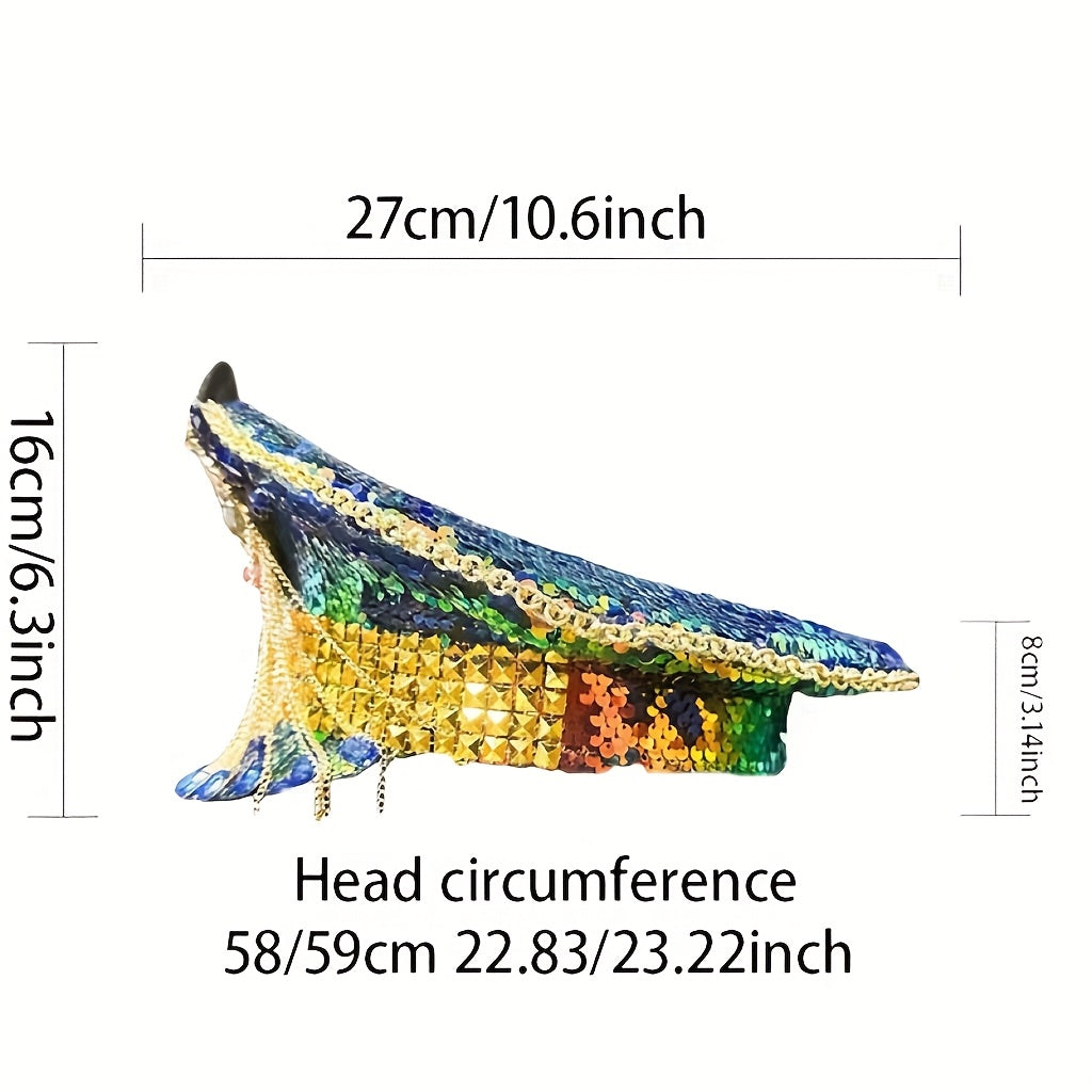 Sparkly Rhinestone Military Captain Hat with Glitter Sequins & Golden Chains - Steampunk Army Hat for Burning Man Festival, Music Festivals, Raves, Costume Parties | Shiny Festival Headwear, Bold Party Accessories, Eye-Catchi