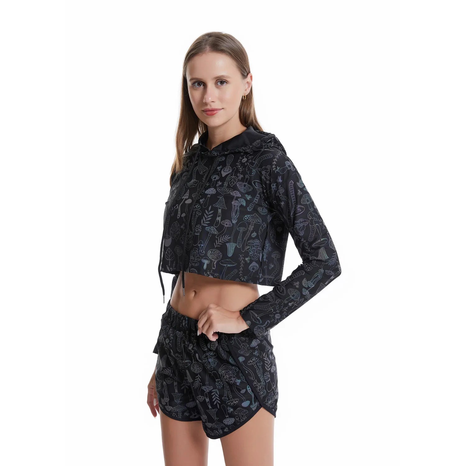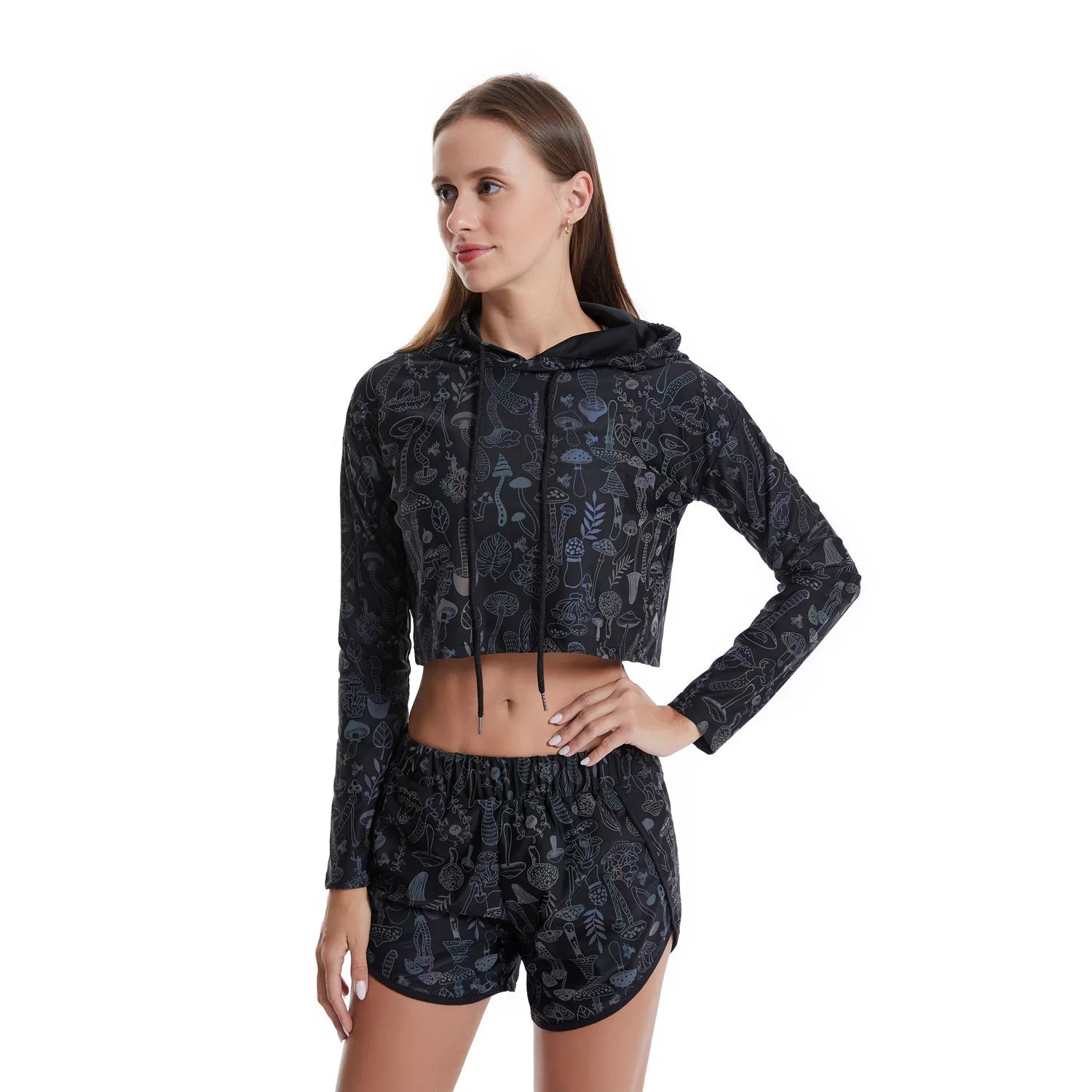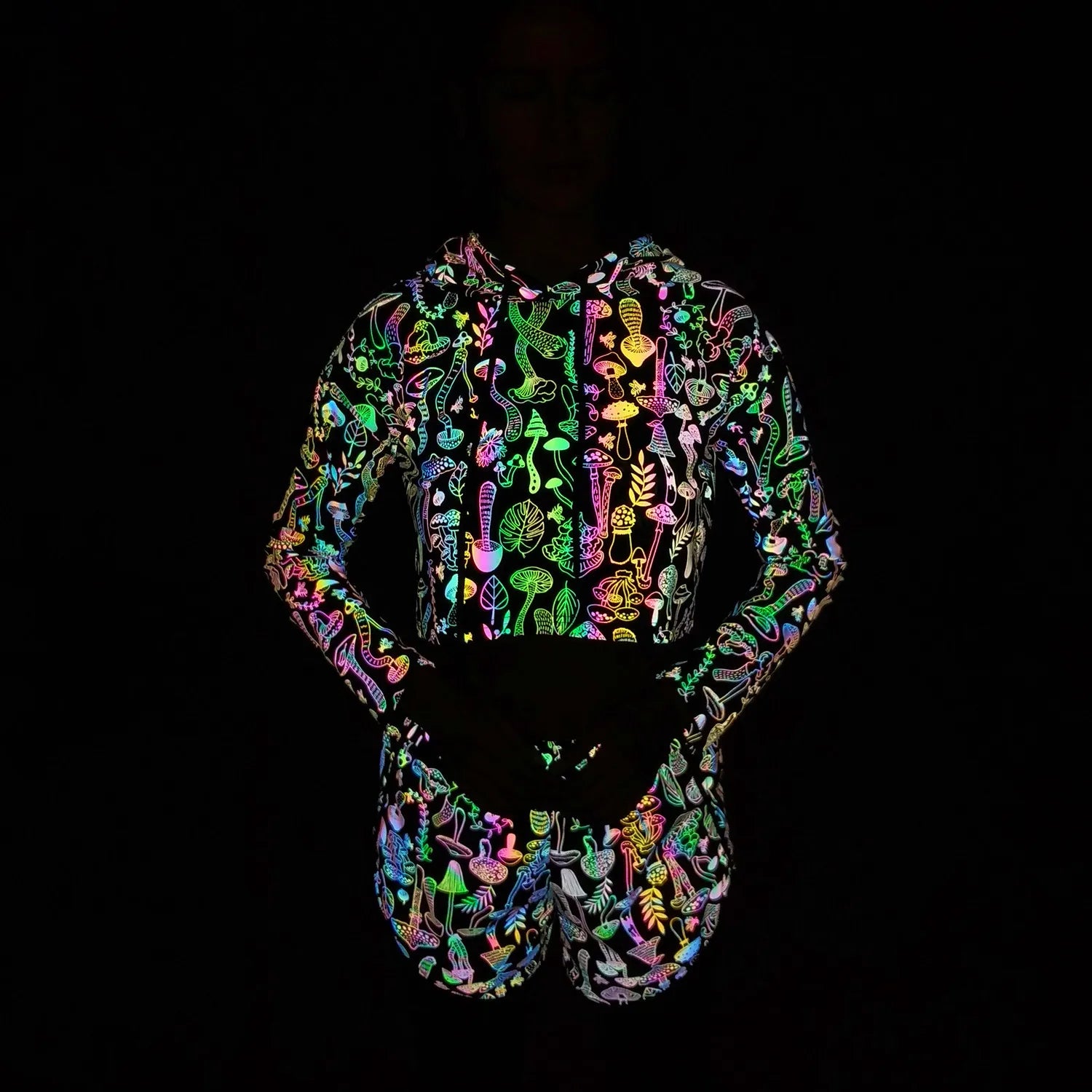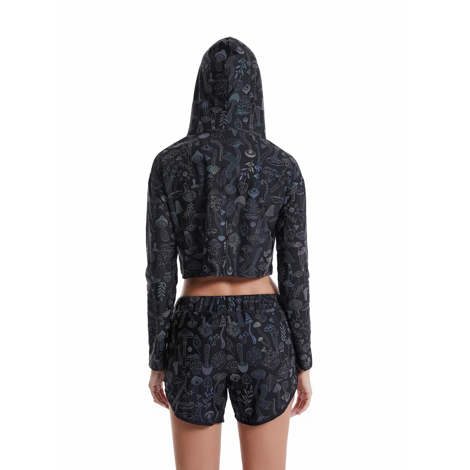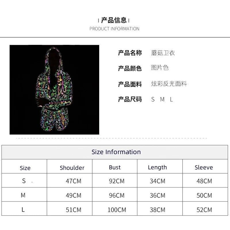 Spring Autumn Women Colorful Reflective Pullover Hoodies Y2K Harajuku Mushroom Printed Long Sleeve Crop Tops
