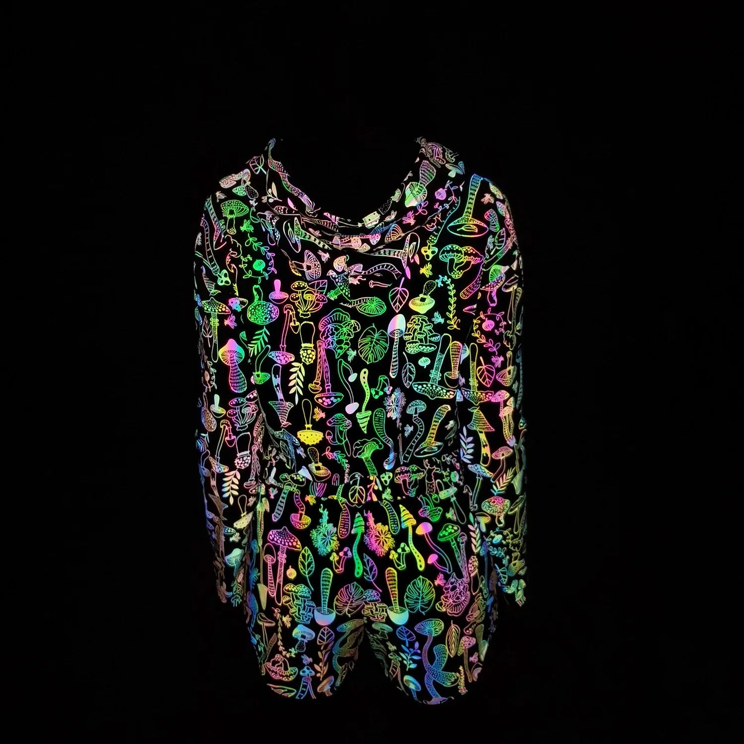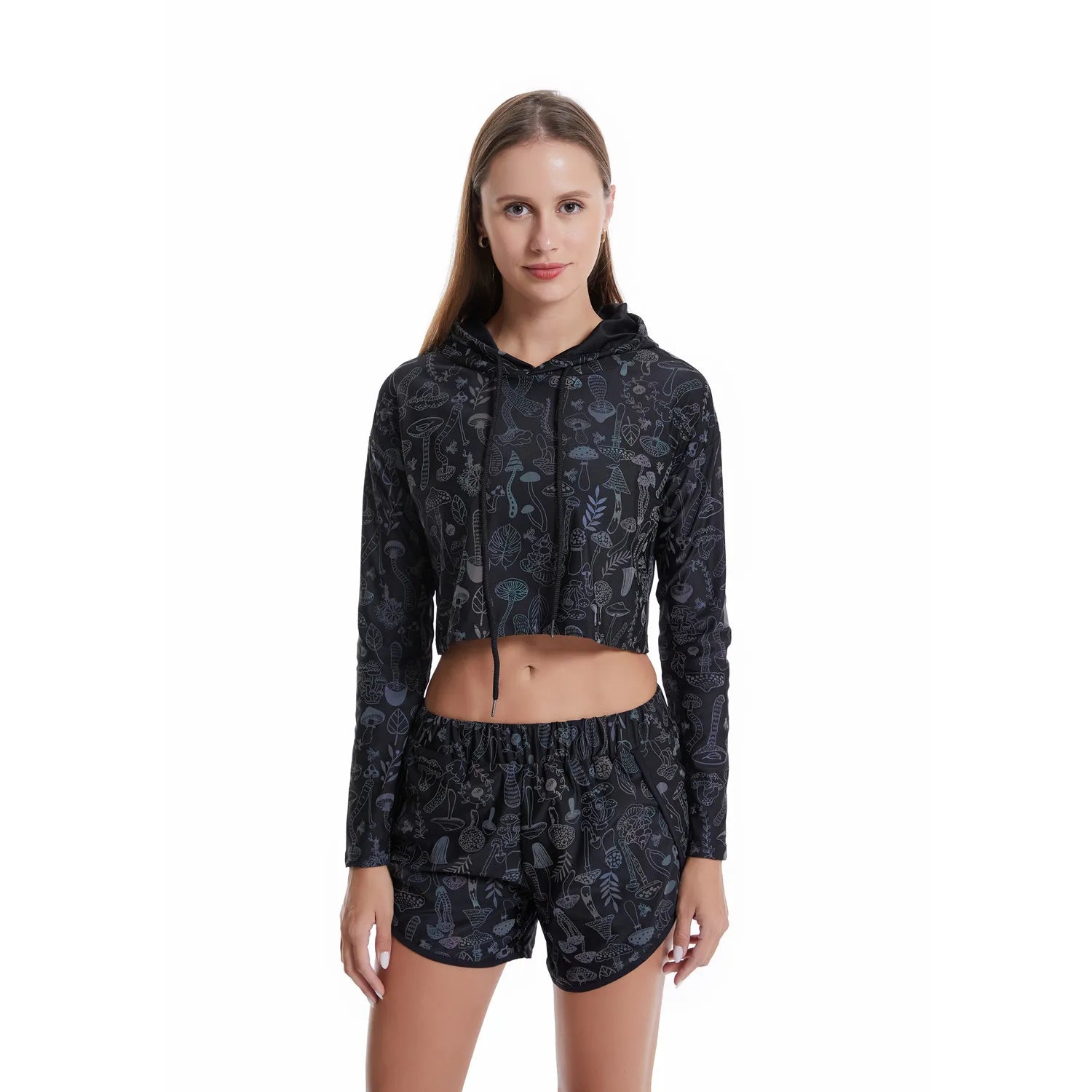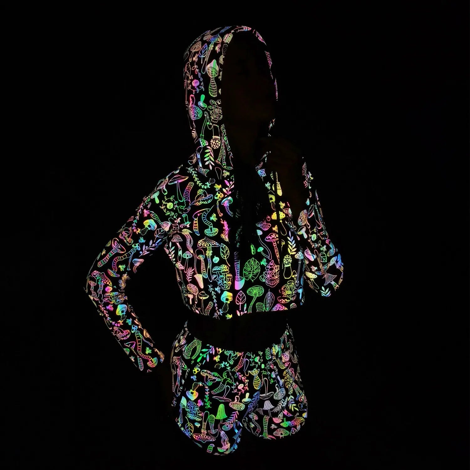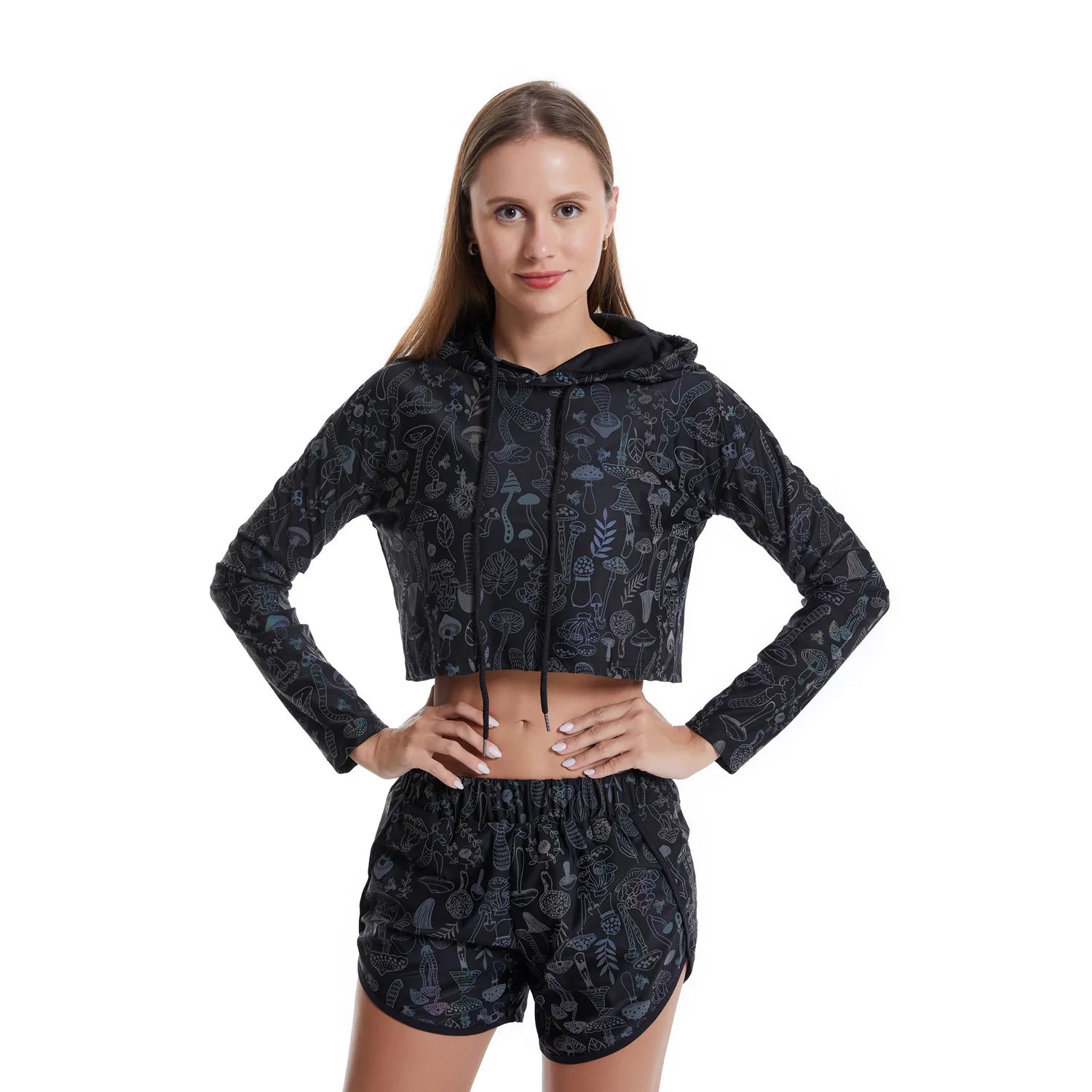 Spring Autumn Women Colorful Reflective Pullover Hoodies Y2K Harajuku Mushroom Printed Long Sleeve Crop Tops