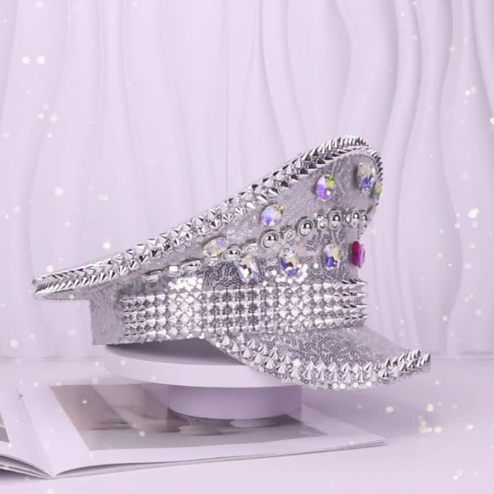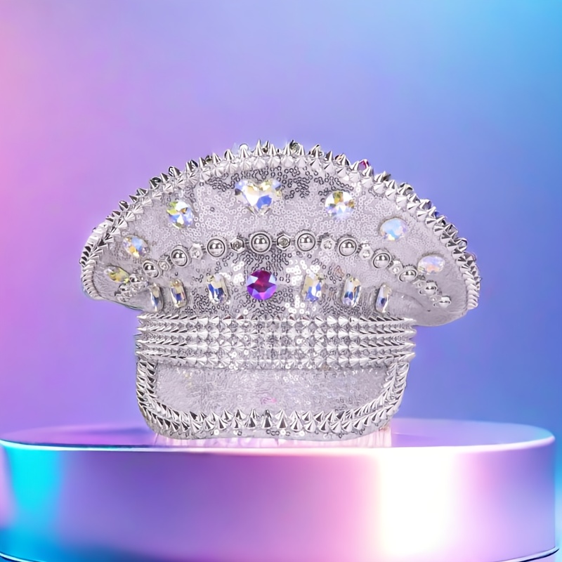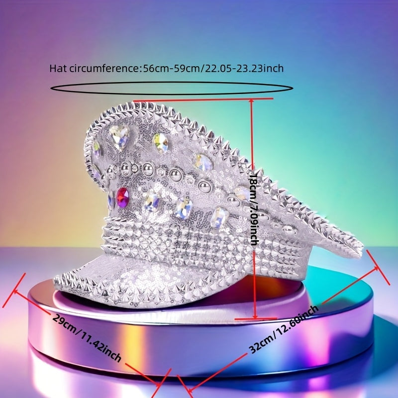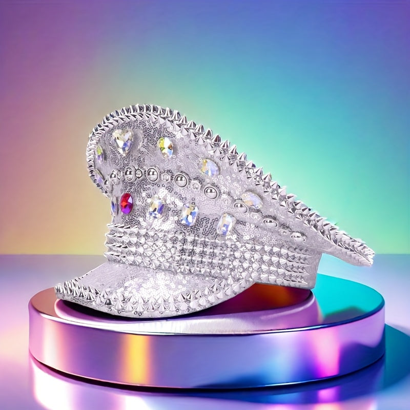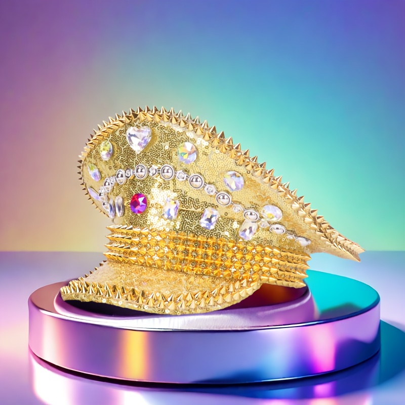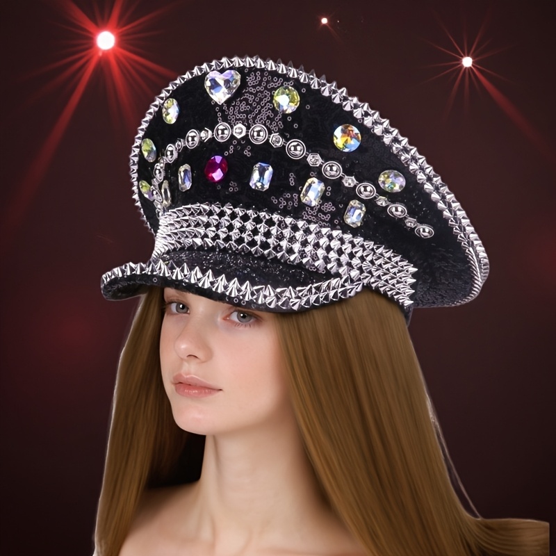 Vibrant Captain Style Party Hat with Rivets and Large Rhinestone Synthetic Gemstone - Suitable for Halloween, Music Festivals, Bachelor Parties etc. - Fun Accessory for Costume Parties and Celebrations - Great Gift for Birthd