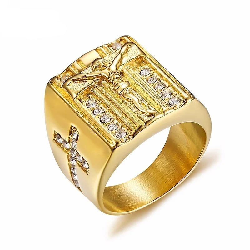 18K Gold Plated Vnox Punk Jesus Christ Cross Chunky Ring
