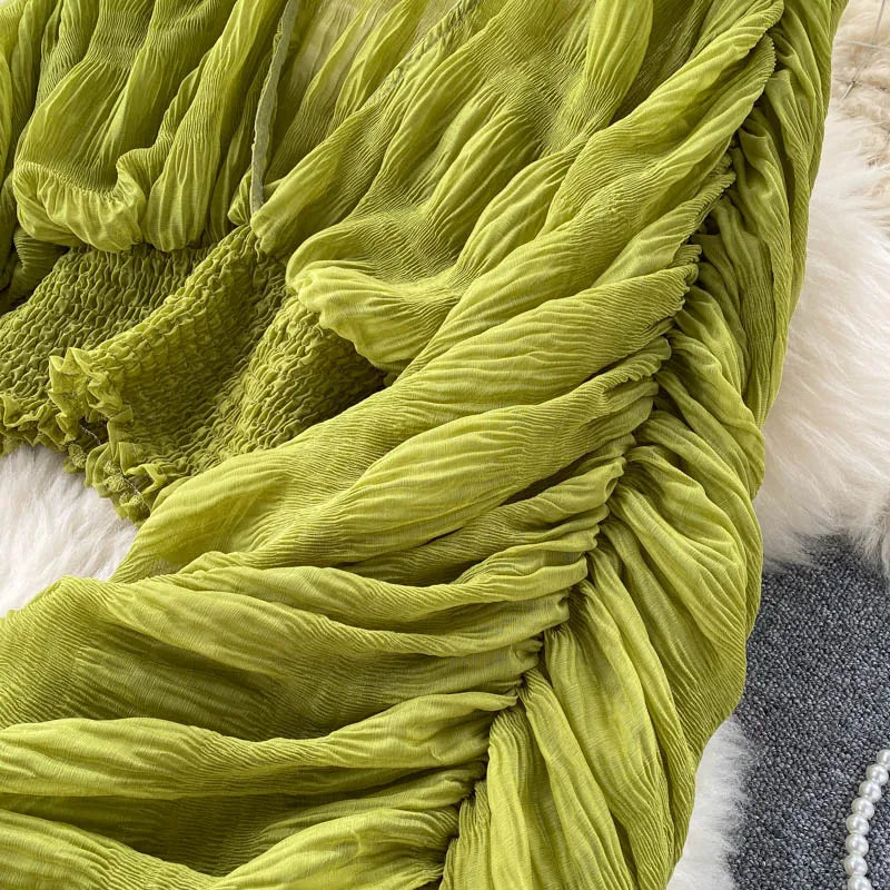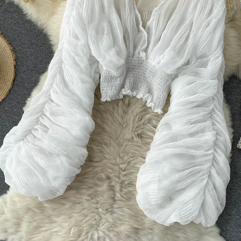 Women Sexy Chiffon Short Blouse Female See Through Super Long Sleeve Blusas Purple/Green/Black/White Folds Party Tops 2022 New