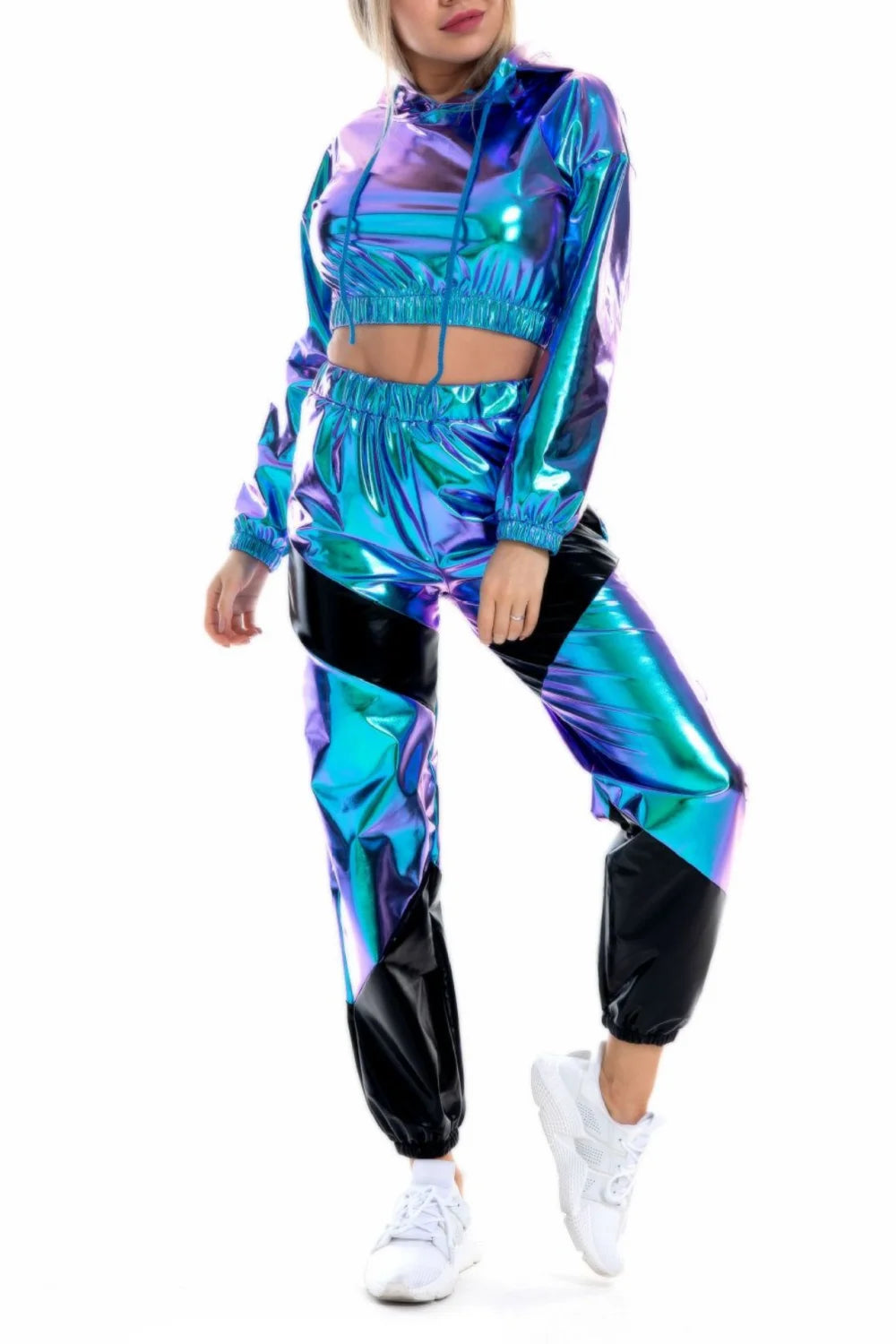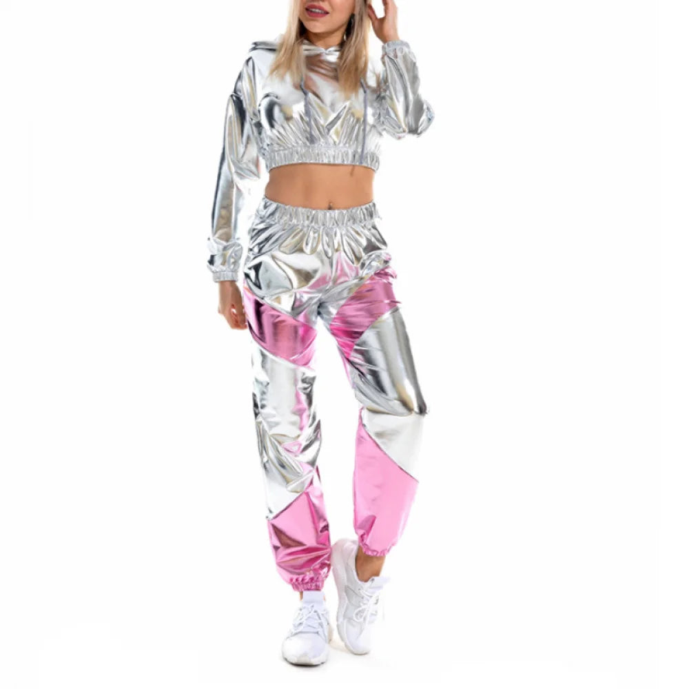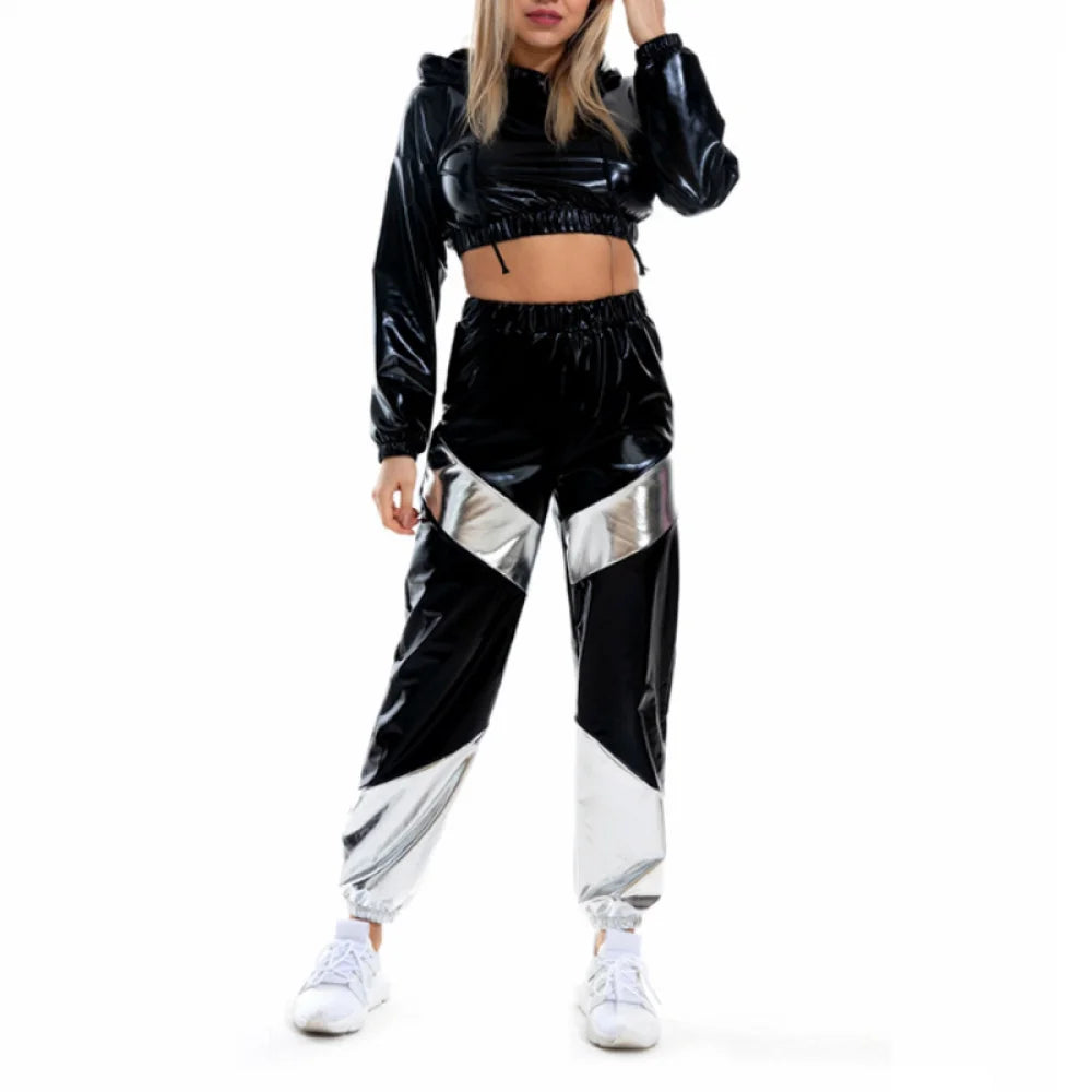 Shiny Crop Top Hoodie Metallic Casual trousers