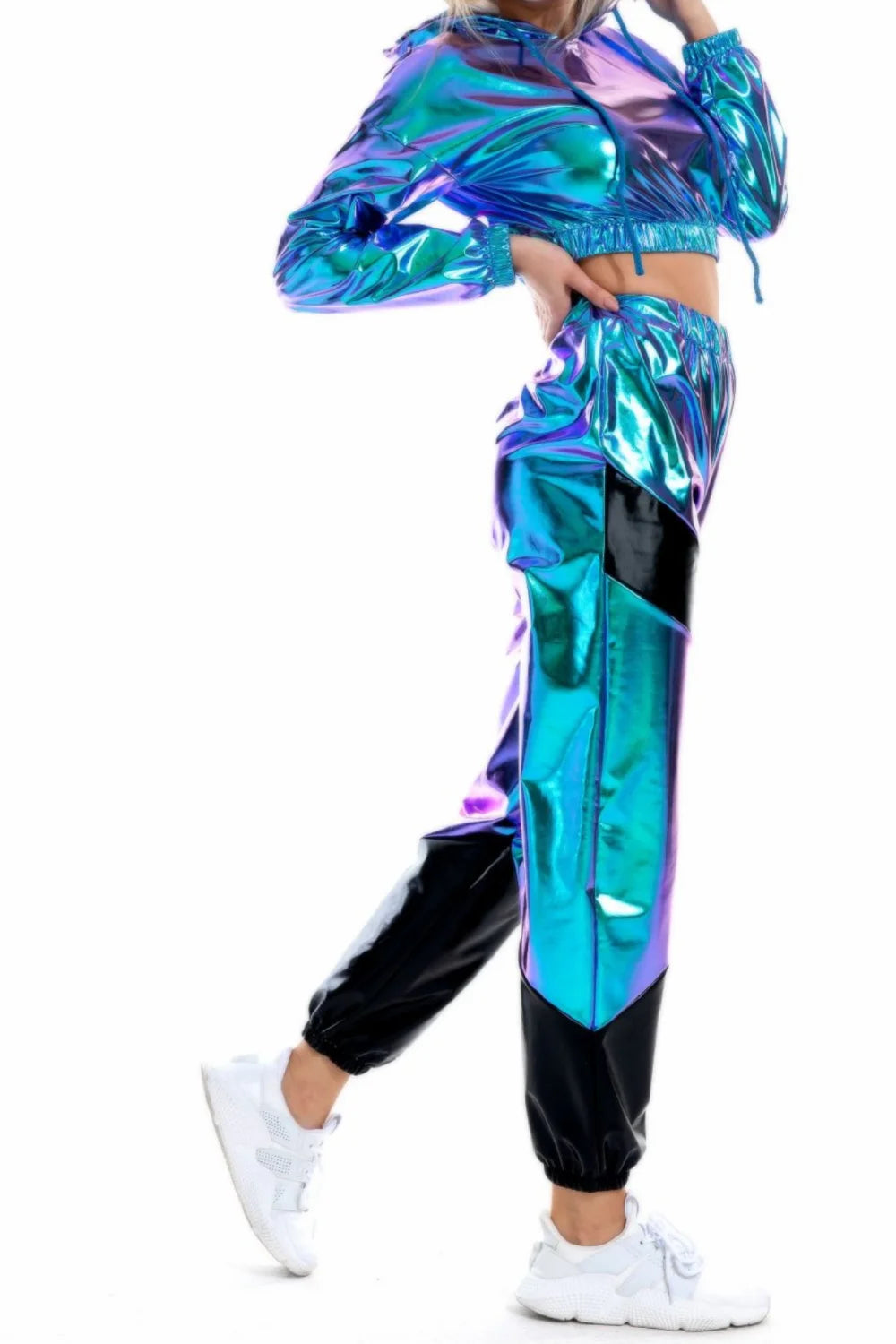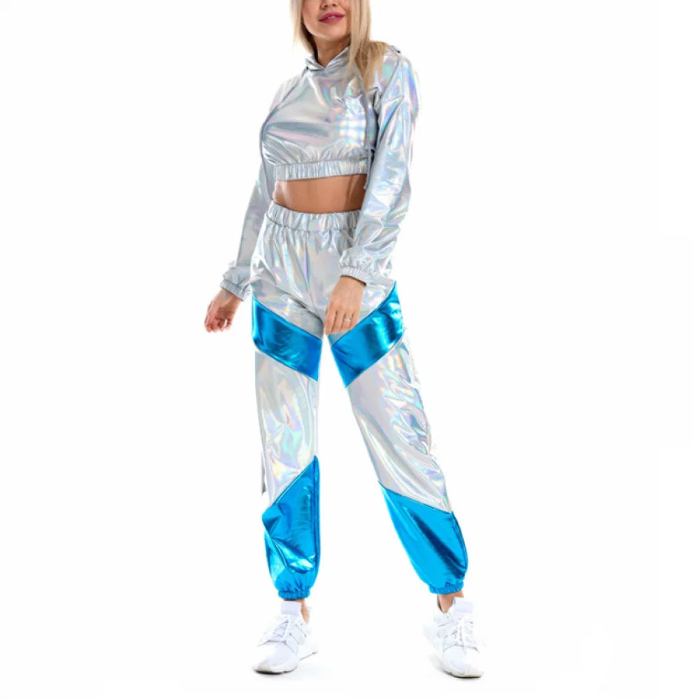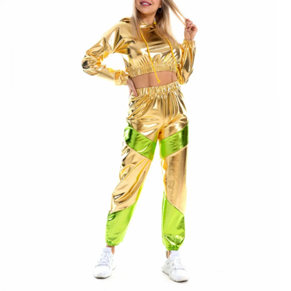 Shiny Crop Top Hoodie Metallic Casual trousers